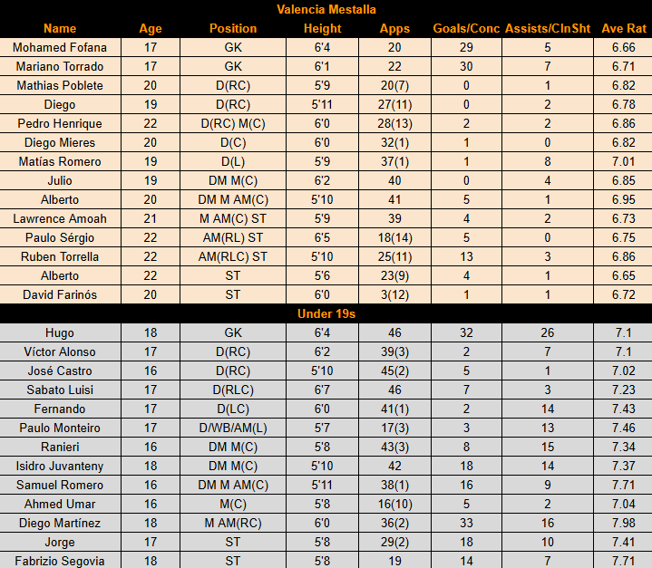 Valencia Mestalla survived in LaLiga 2, finishing 14th with 50 points led by Ruben Torrella’s 13 goals. The U19s won their league group undefeated but lost to Girona in the semis, with standout performers including midfielders Diego Martínez’s 33 goals and 16 assists and Isidro Juvantemy’s 18 goals and 14 assists, Ranieri’s 15 assists and left backs Fernando and Paulo Monteiro sharing 27 assists. See all the youth players’ stats by clicking the table below.