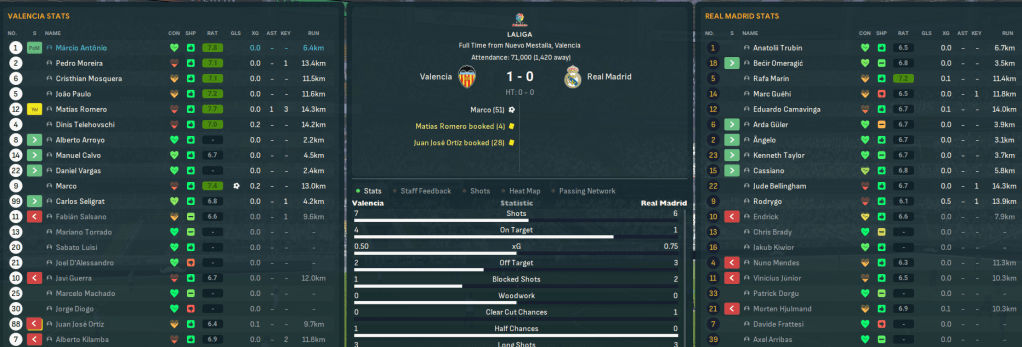Game 1 – Real Zaragoza (17th, home): Valencia laid down a marker as Marco and centre back Cristhian Mosquera scored two in a 7-0 thrashing of Zaragoza. That sent them top ahead the day before El Clásico, which Barca won 3-2 thanks to winger Alfred’s 91st-minute winner. So Valencia led by 3 points with a game in hand, but they lost Marco for 3 weeks with a twisted ankle.