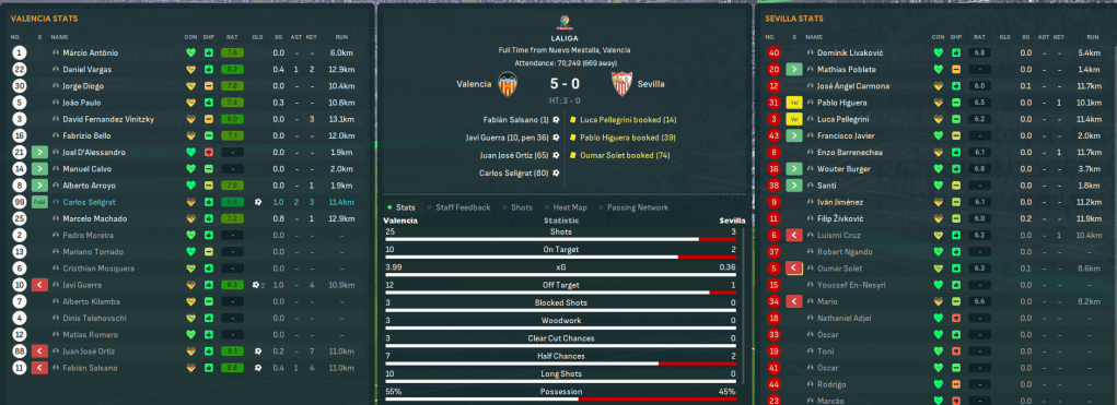 Game 5 – Sevilla (14th, home): Three days later, Valencia played their final home game of the season the day before Real. They went straight on the attack and scored after 17 seconds through Salsano’s brilliant volley. The striker then teed up Guerra to double the lead, it was all over when Guerra scored a penalty and Ortíz and Seligrat wrapped up a thumping victory. The next day, Real hammered bottom-side Tenerife 8-0 to take the battle to the final day.