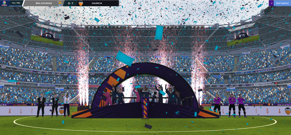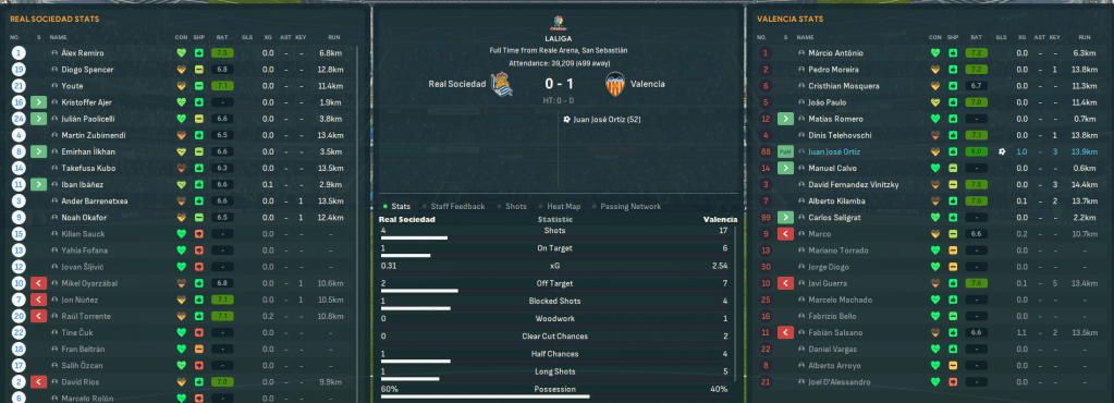 Game 6 – Real Sociedad (5th, away): A first Spanish title in 28 years was on the line as Valencia went to 5th place Sociedad with a 1-point lead over Real, who visited 13th-place Celta. The big game started slowly with the only highlight being Marco hitting the post, but Real were winning 2-1 so topped the league at the break. Lazaró fired the team up and got his reward as Salsano’s shot rebounded to Ortíz to slam his side in front. Real raced into a 4-1 lead so Valencia had to hold on and, despite dominating the game, they did to win 1-0.