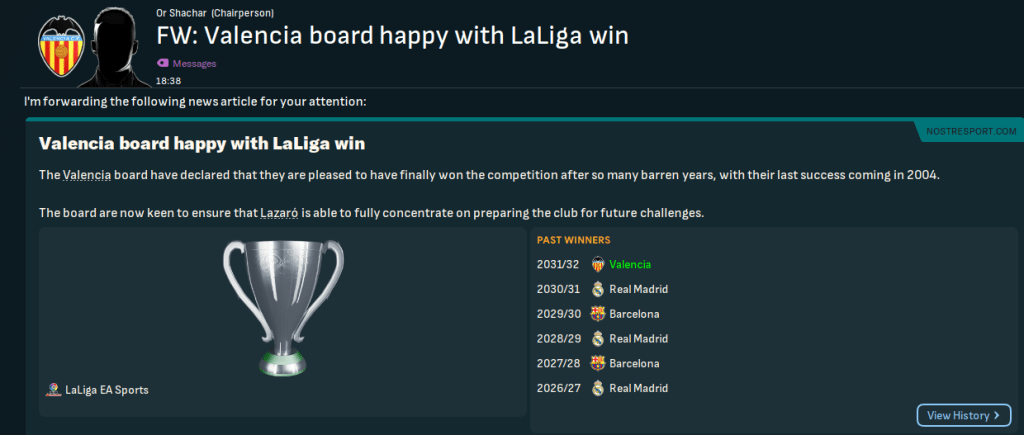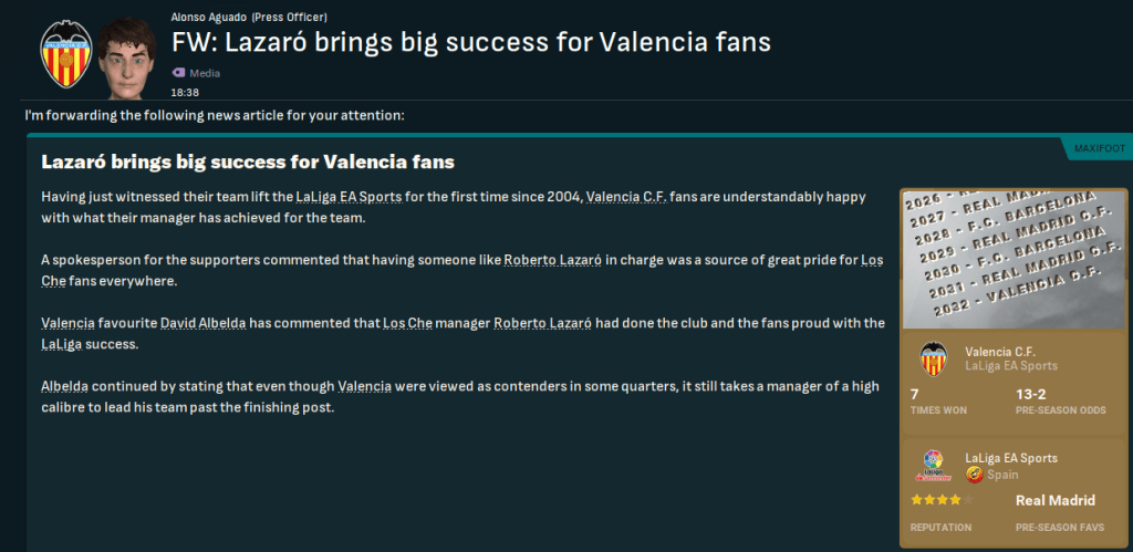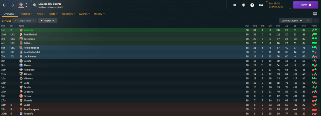 Napoli were up next and Valencia struggled to a 1-1 at home, but giant centre back Sabato Luisi powered in second-half headers for a 2-1 away. Valencia again faced Spurs in the quarters but conceded Spurs’ first shot in the home leg before growing into the game, levelling through Guerra’s penalty and gifting a late winner. Lazaró rotated for the return leg and lost 3-1 to exit the competition. Spurs went on to reach the Final but lost 3-0 to Real Madrid, who surprisingly won it for the first time in this save.