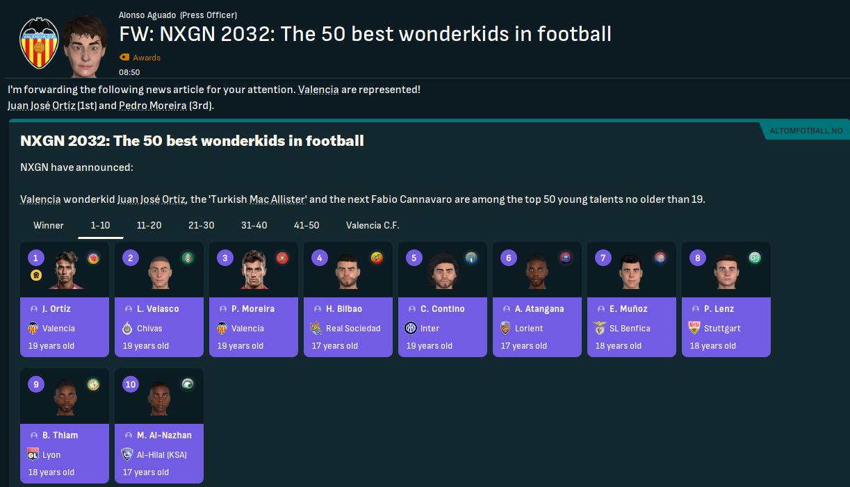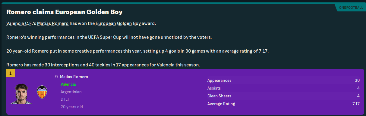 Romero was a surprise winner of European Golden Boy, becoming the second Valencia player to win it after Salsano, who came 2nd in Kopa Trophy. And two of this season’s signings were in the top 3 of NxGn 2032, which was won by Ortíz with Moreira 3rd.