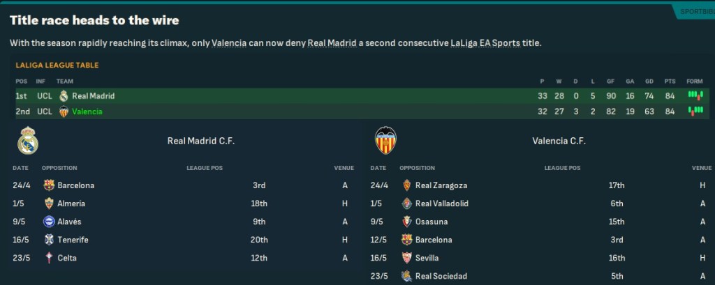 Valencia eased to wins over Betis and Athletic before a disappointing 2-1 defeat at Girona. They got back on track by defeating Las Palmas 3-1, while Real lost the Madrid derby 2-1 at Atlético, and beat struggling Almería 2-0. That moved them level on points with Real with a game in hand heading into a two-horse title race, in which both teams had to travel to Barca and Valencia had 4 away days.