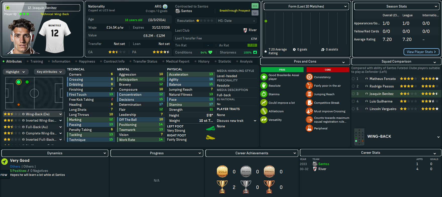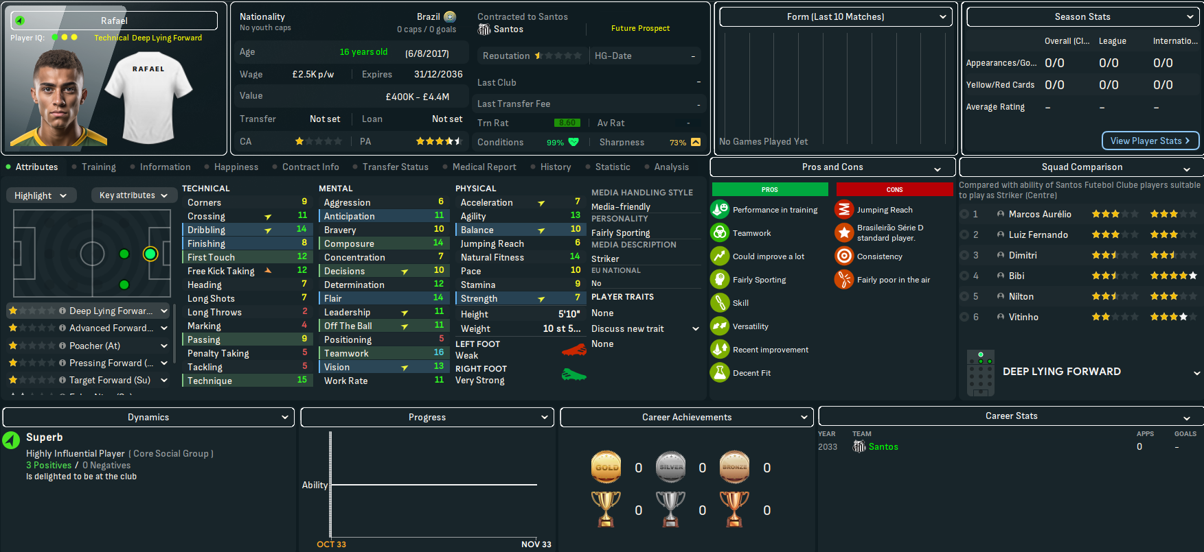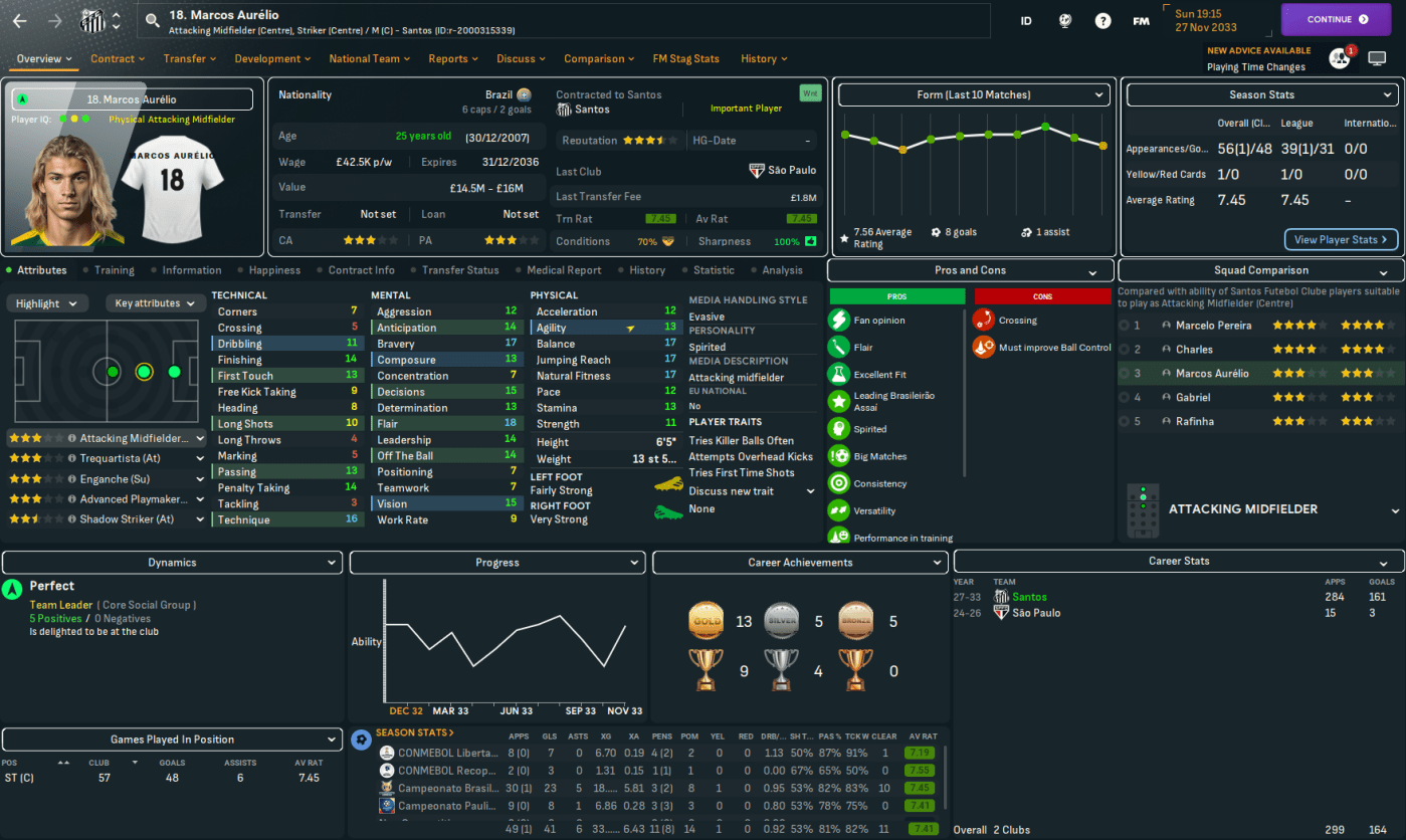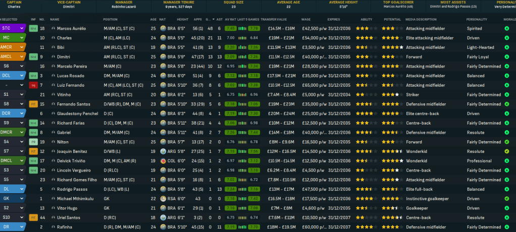 2033 had been a really mixed bag for Santos, but Lazaró was delighted with his team’s efforts against Europe’s big boys and winning a 4th title despite selling 2 key defenders for over £80m. Aurélio was a superstar this season, scoring an incredible 48 in 57 (but only 41 count towards his new club record), followed by Charles with 21 goals and 11 assists. Young Bibi also impressed with 13 goals and 9 assists along with Dimitri (13 goals and 13 assists), Pereira (10 goals and 12 assists), Rosado (9 goals and 6 assists), Fernando (8 goals and 6 assists), Passos (13 assists) and Rafinha (11 assists).
