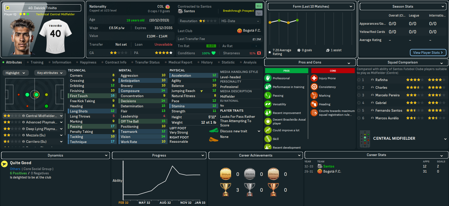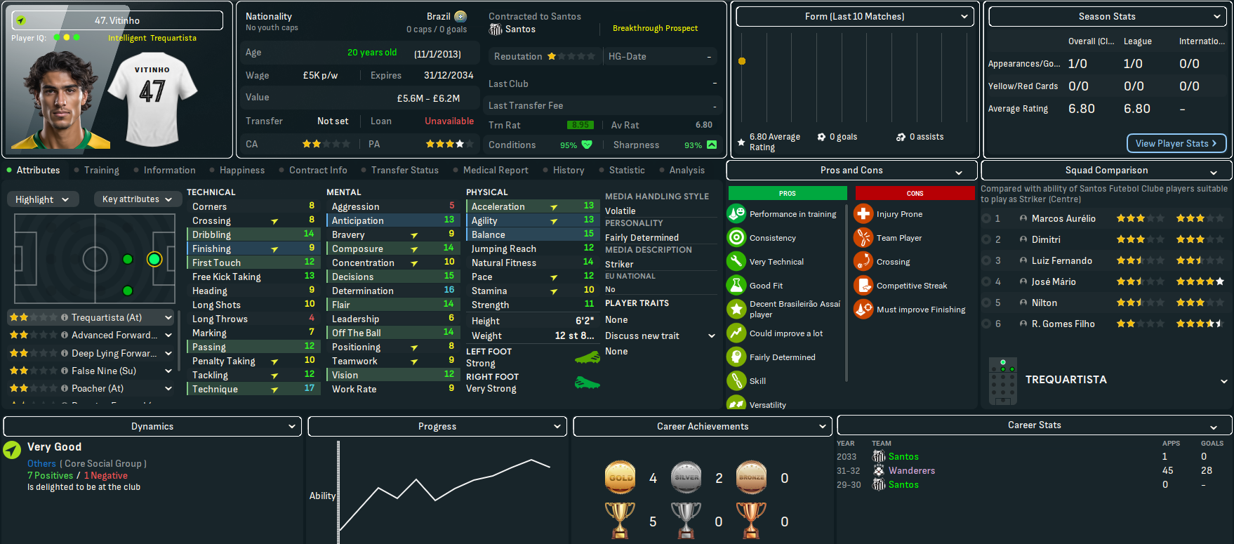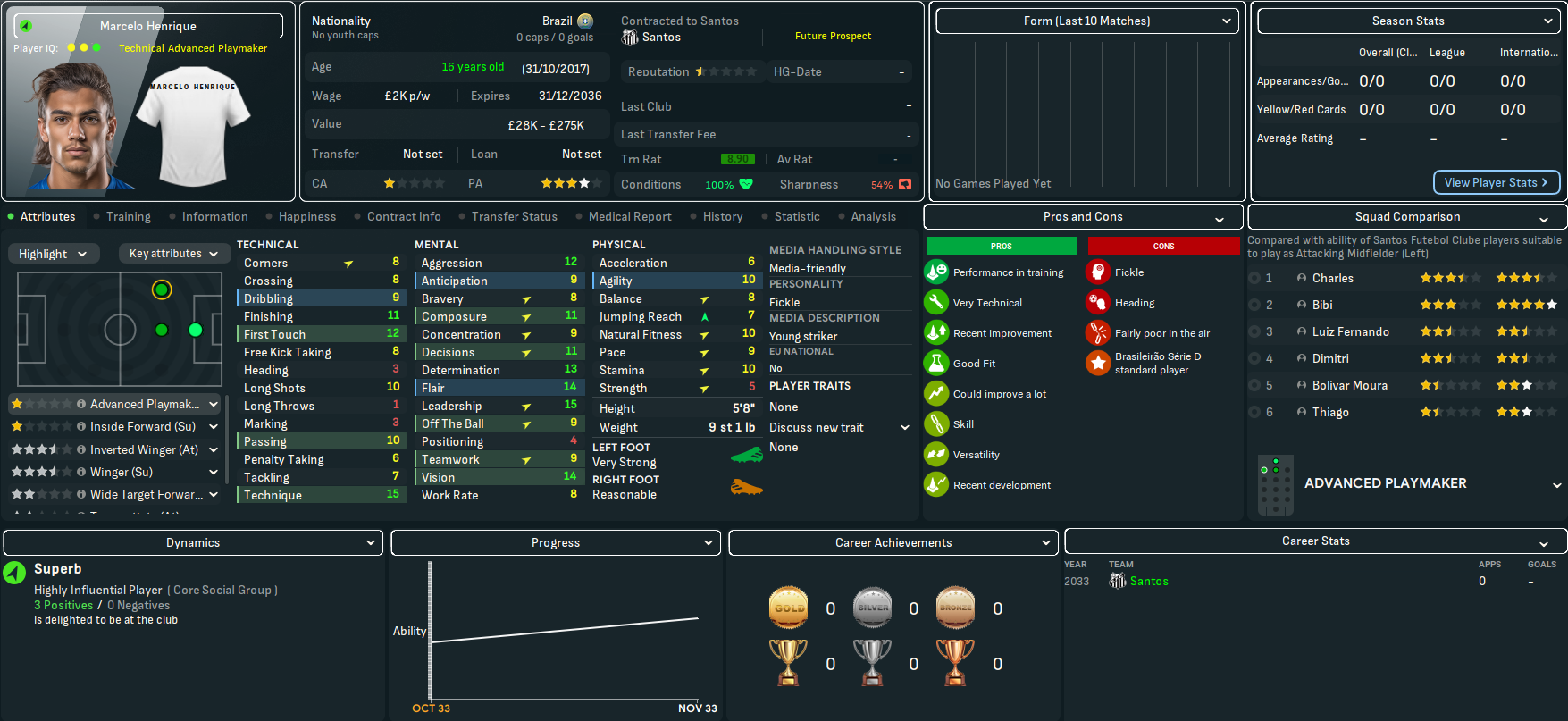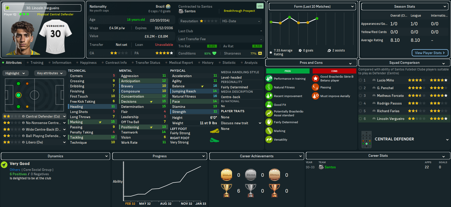 2033 had been a really mixed bag for Santos, but Lazaró was delighted with his team’s efforts against Europe’s big boys and winning a 4th title despite selling 2 key defenders for over £80m. Aurélio was a superstar this season, scoring an incredible 48 in 57 (but only 41 count towards his new club record), followed by Charles with 21 goals and 11 assists. Young Bibi also impressed with 13 goals and 9 assists along with Dimitri (13 goals and 13 assists), Pereira (10 goals and 12 assists), Rosado (9 goals and 6 assists), Fernando (8 goals and 6 assists), Passos (13 assists) and Rafinha (11 assists).