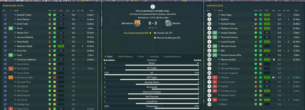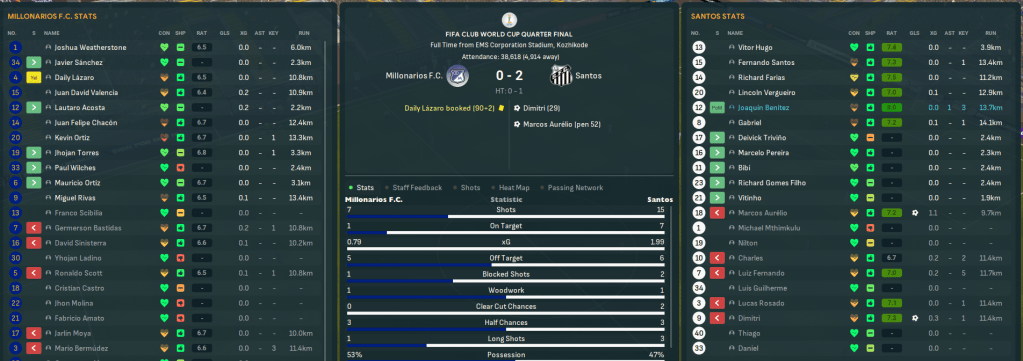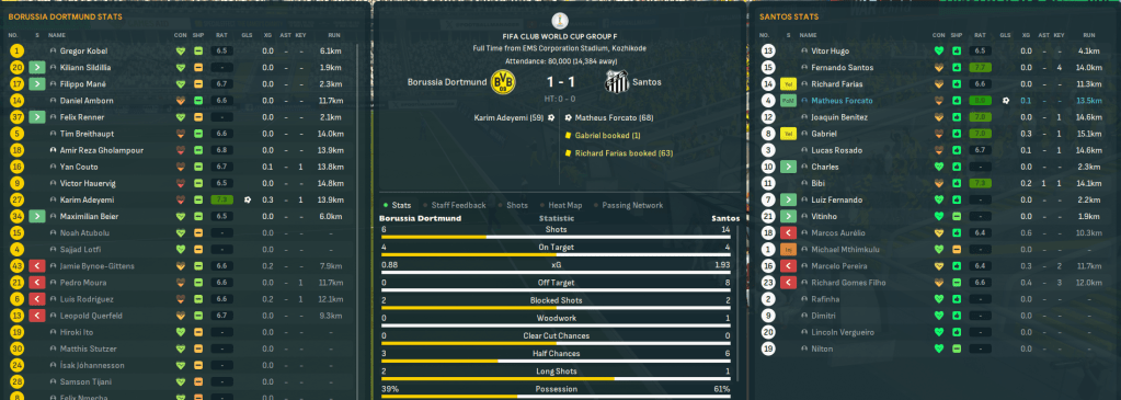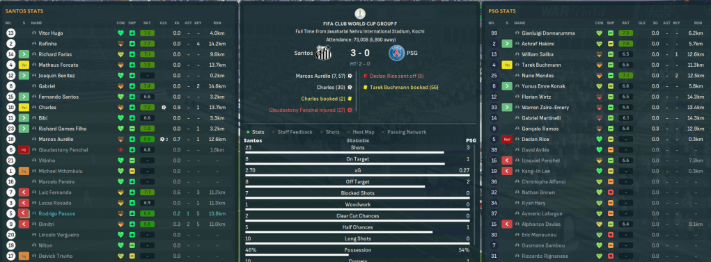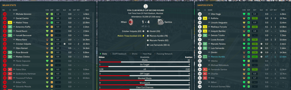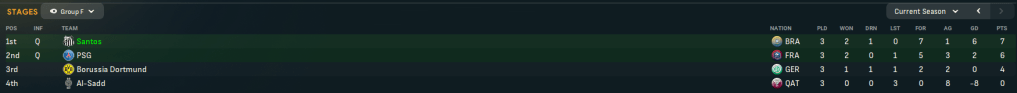Lazaró had to rotate for Dortmund, but they dominated the first half without converting. Adeyemi gave Dortmund an undeserved lead, but Santos responded. The group wrapped up against Al-Sadd and Santos again started on the front foot, peppering the goal with 24 shots in the first half while giving up 0, and took advantage with two superb Aurélio headers. Pereira added a 3rd, and they strolled to 1st place.
