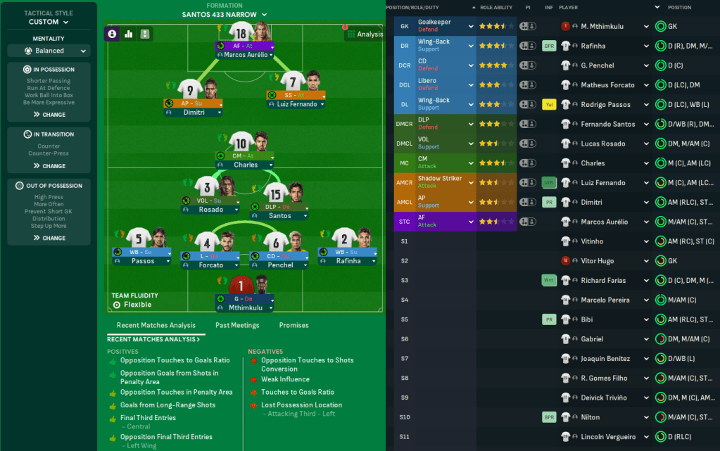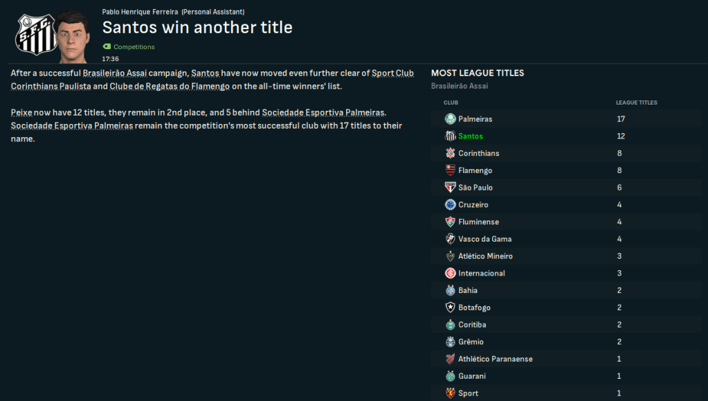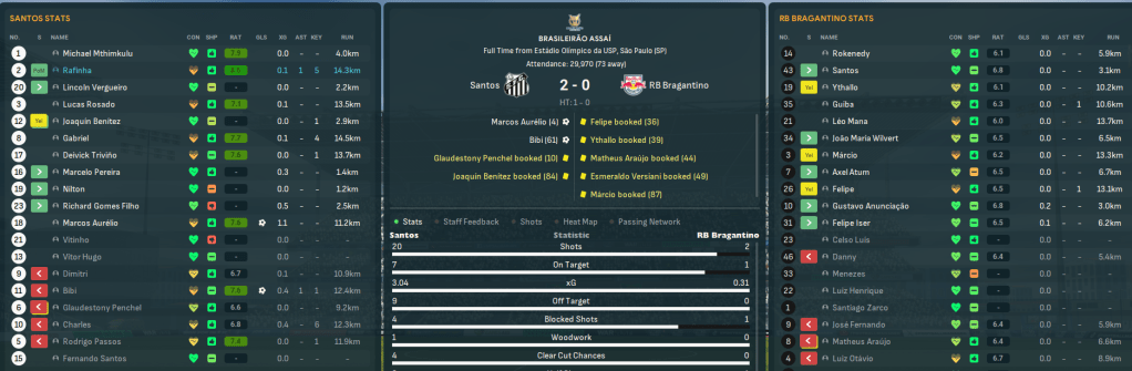 Santos went on to win the league by 5 points, finishing on 89 points after 28 wins, 5 draws and 5 defeats, scoring 82 and conceding 28. Aurélio was the league’s top scorer with 23 in 31 and the best player with a 7.45 average rating and 8 MOTM awards. While Passos got the 2nd-most assists with 10.