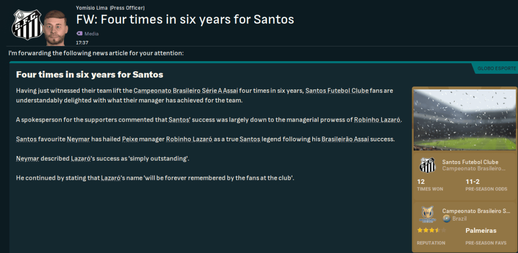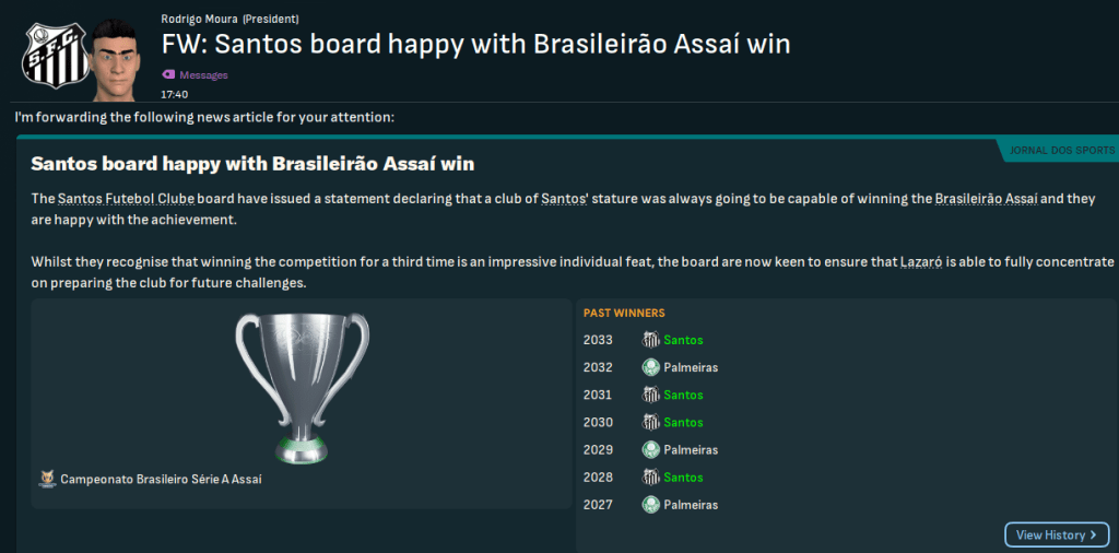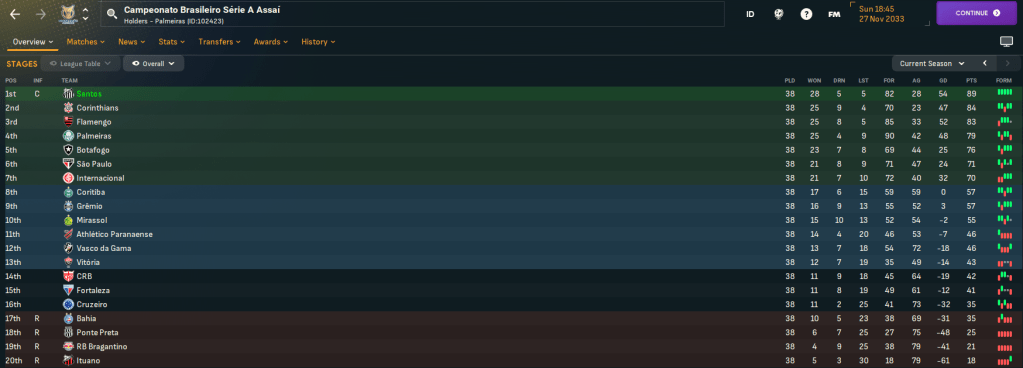 The big positive about not winning the title was the Santos board relaxed their expectations, now wanting the side to challenge for Série A and Copa Libertadores rather than winning the lot. They also announced plans to expand Santos Stadium by 16,000 seats at a cost of £29m, so Santos will play the 2033 season at the 30,000-capacity Estádio Olimpico da USP, an unused stadium that was randomly built this year.