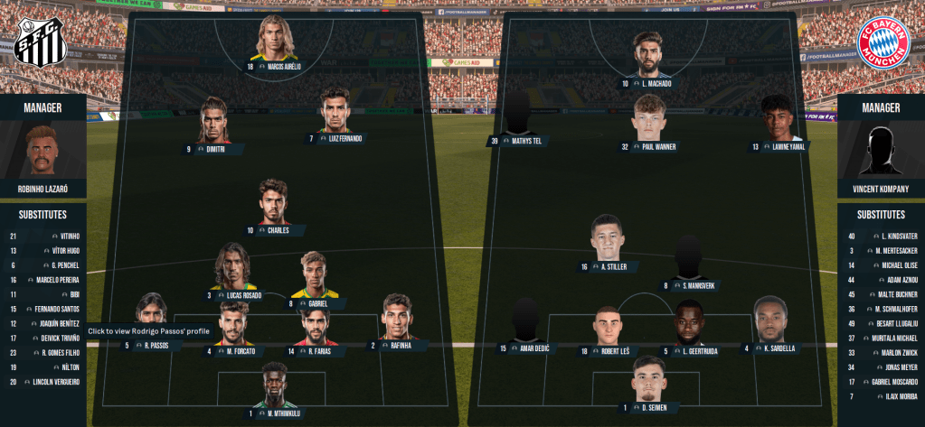 That sent Santos into their second World Club Cup Final, after losing to Barcelona in 2011 in the old format. They took on another European giant, Champions League runners-up FC Bayern, who had Lazaró’s former striker Machado and Lamine Yamal. Penchel was just about fit, but Lazaró lined up: