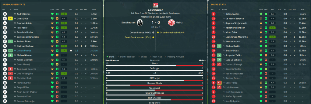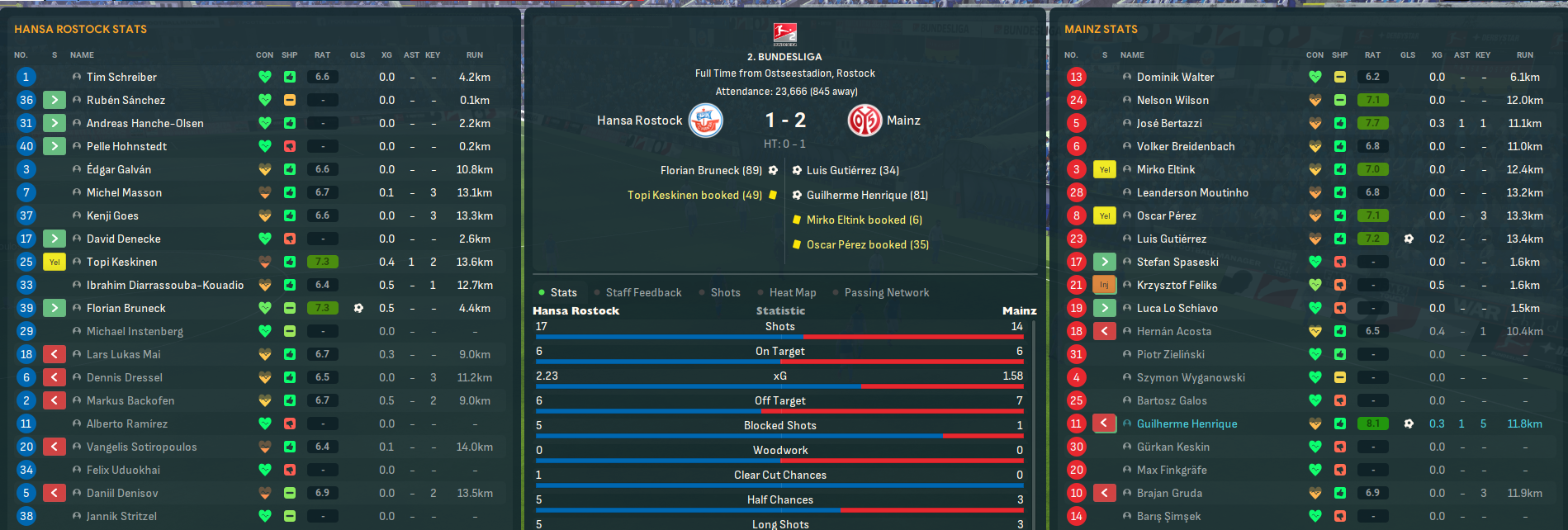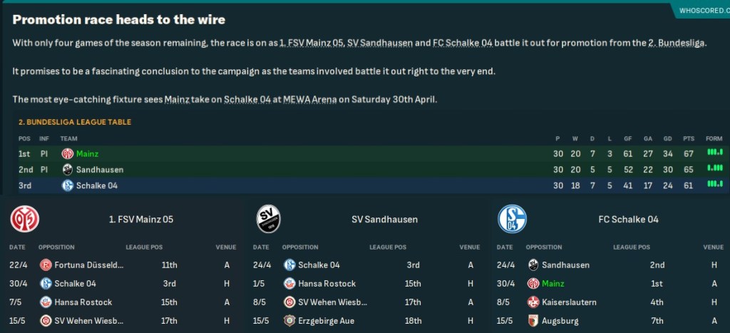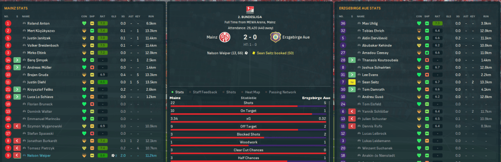 Game 1 – Dusseldorf (11th, away): Mainz’s title push began wotjh a disappointing performance and a 2-1 defeat. Two days later, their two rivals went head-to-head and drew 1-1, leaving Mainz 1 point clear.#