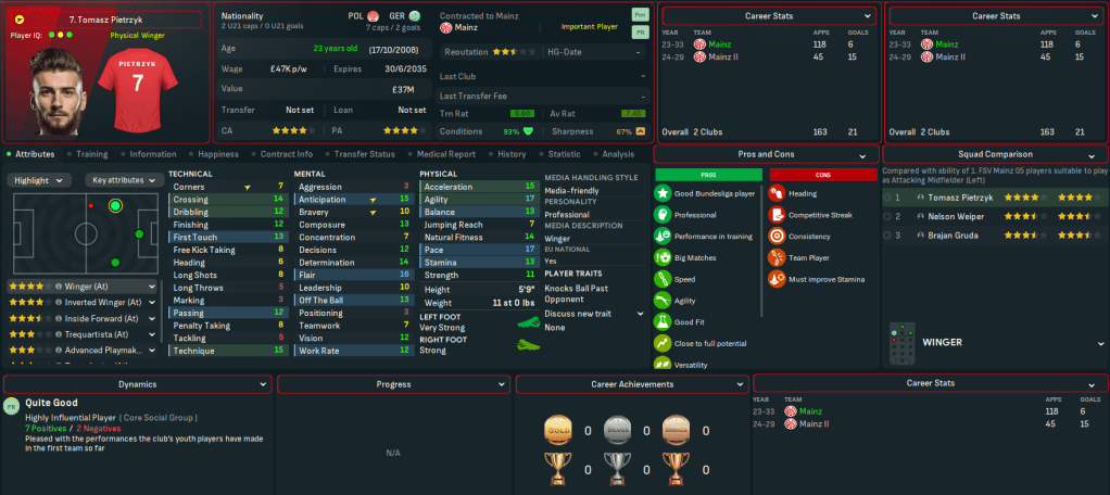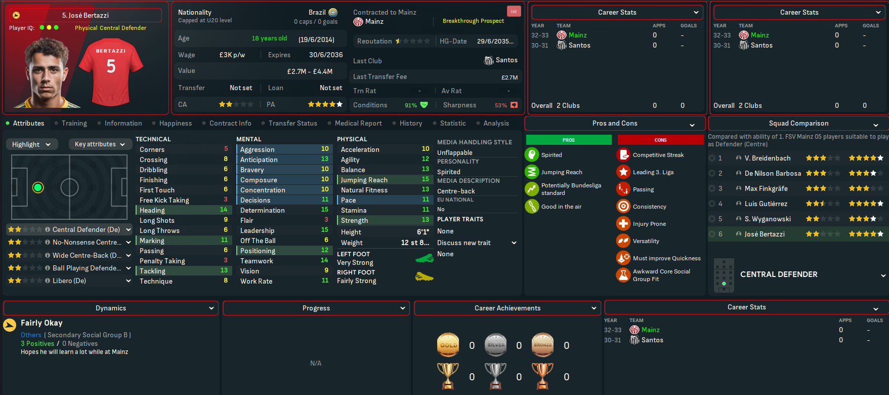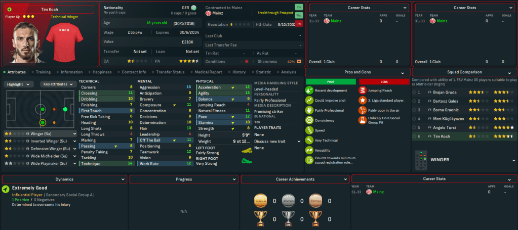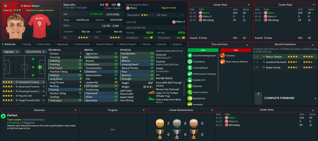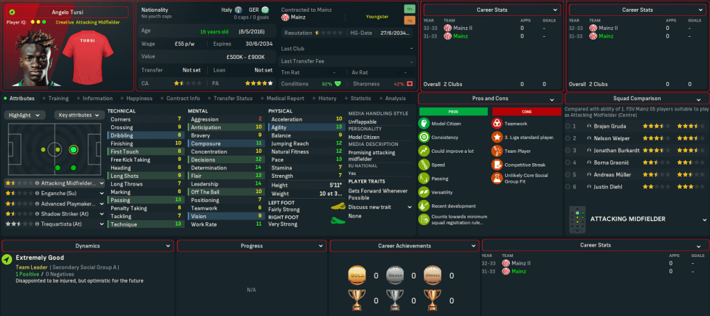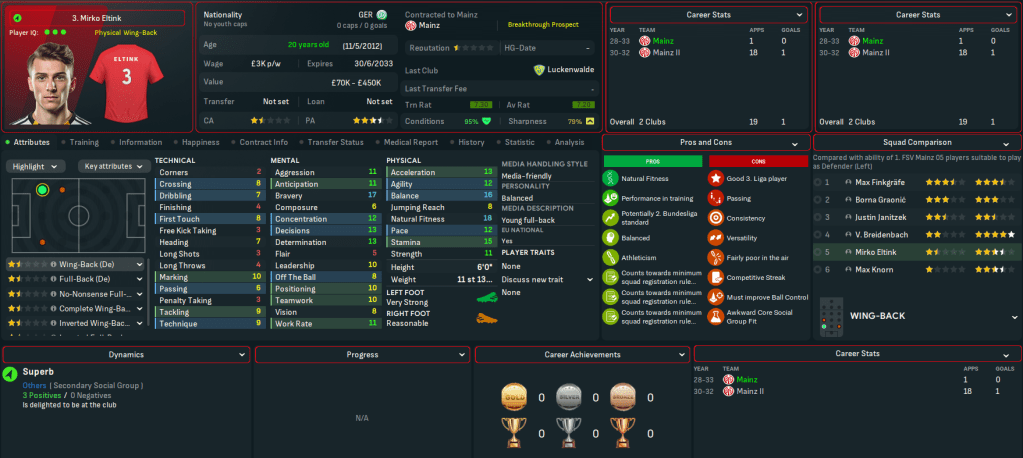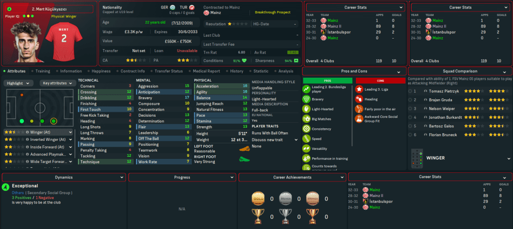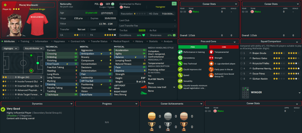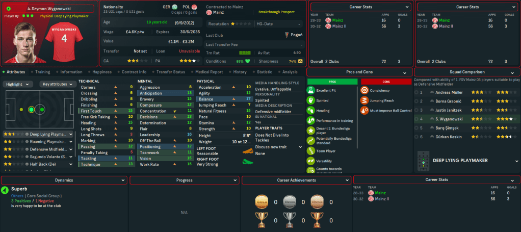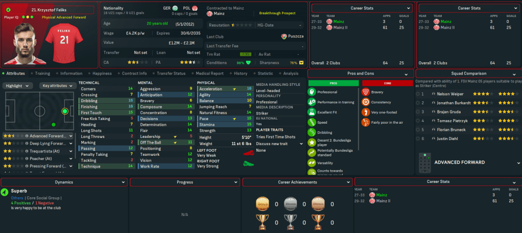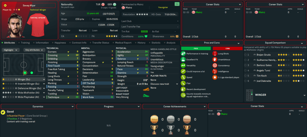 The good news was that Mainz had established homegrown players in strikers Nelson Weiper, who’s been worryingly goalshy in this save, and Jonathan Burkardt, German international winger Tomasz Pietrzyk, midfielder Brajan Gruda and goalkeeper Roland Anton. There were also a few decent prospects coming through like midfielder Szymon Wyganowski, winger Krzysztof Feliks, centre back Volker Breidenbach and full backs Mirko Eltink and Mert Kucukyazici. And there were a few youngsters to keep an eye on, in winger Angelo Tursi, striker Tim Koch and midfielder Marcel Henke.