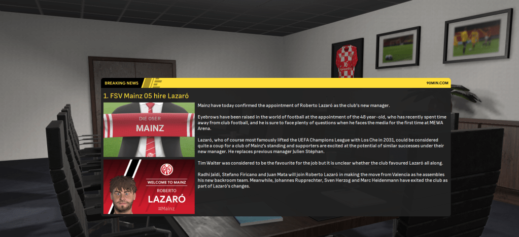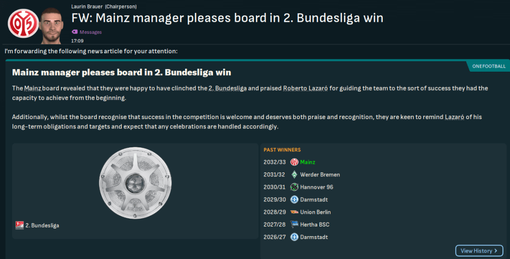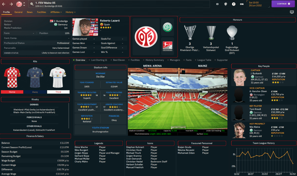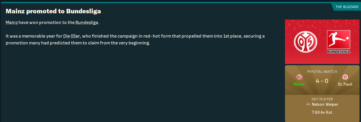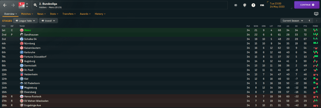 1. FSV Mainz 05 began this save in Bundesliga, finishing in 6th place in season 2. However, they got relegated in 2031 and failed to get promoted last season, finishing down in 6th place in 2. Bundesliga.