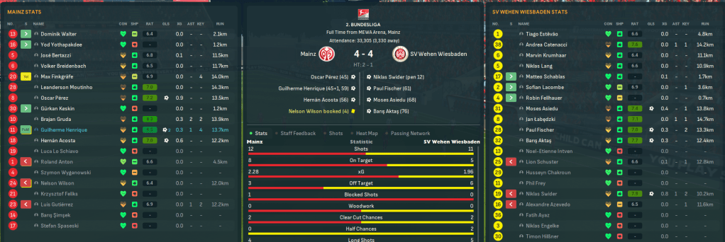 Game 4 – Wehen Wiesbaden (17th, home): That meant a win at home to Wiesbaden, who needed to win to survive, would win the league on the final day. Mainz started well, only for the ref to award a nonsense penalty while Sandhausen raced into a 3-0 lead over Erzgebirge. Pérez eventually got them level and, straight from the kick off, Henrique headed them in front. Acosta quickly doubled the lead after the break and Henrique swept in his second… only for the defence to capitulate and ludicrously draw 4-4. But luckily, sandhausen let one in to, despite the lack of a trophy ceremony, hand Mainz the title. Mainz won 2. Bundesliga and the club’s first major trophy!