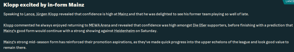 That left Mainz in midtable with just 1 win from Lazaró’s first 5 games, and prompted knobhead Jurgen Klopp to question the new manager. After 5 matches!