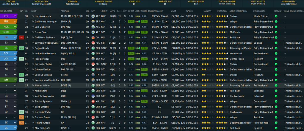 Lazaró enjoyed a solid first season in Germany, led largely by his new South American contingent, who’ll become homegrown in a couple of years. Acosta led the way with 11 goals followed by Henrique (7) and Gutiérrez, Pérez and Barbosa (3), but Gruda impressed with 17 assists followed by Gutiérrez (7), Eltink (4) and Henrique and Acosta (3). Although Weiper was still well clear with 21 goals before his move.