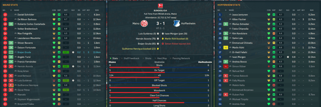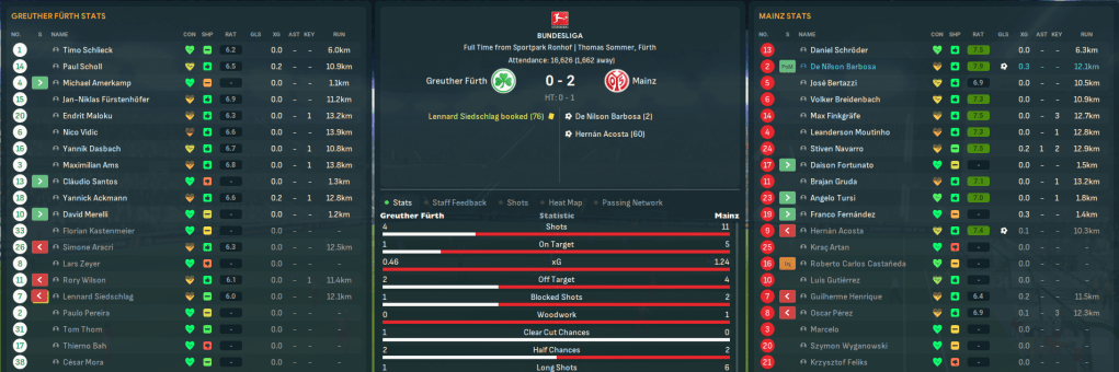 Defeats to Wolfsburg and Leverkusen followed before a couple of huge games in early November. First up, the improving Gutiérrez curled an early opener at home to 16th-place Hoffenheim before the ref awarded a disgrace of a penalty. But Mainz showed a clinical edge to win 3-1 with late Acosta and Fernández goals. A trip to 17th-place Grether Furth followed, and Mainz again got a flyer with a special 25-yard volley by right back De Nilson Barbosa. That goal was arguably bettered by Acosta, who picked the ball up 20 yards out, turned and smashed it into the corner after an hour. The hosts were restricted to just 1 shot on target and a 2-0 victory took Mainz 12 points clear of any relegation concerns with 13 games remaining.