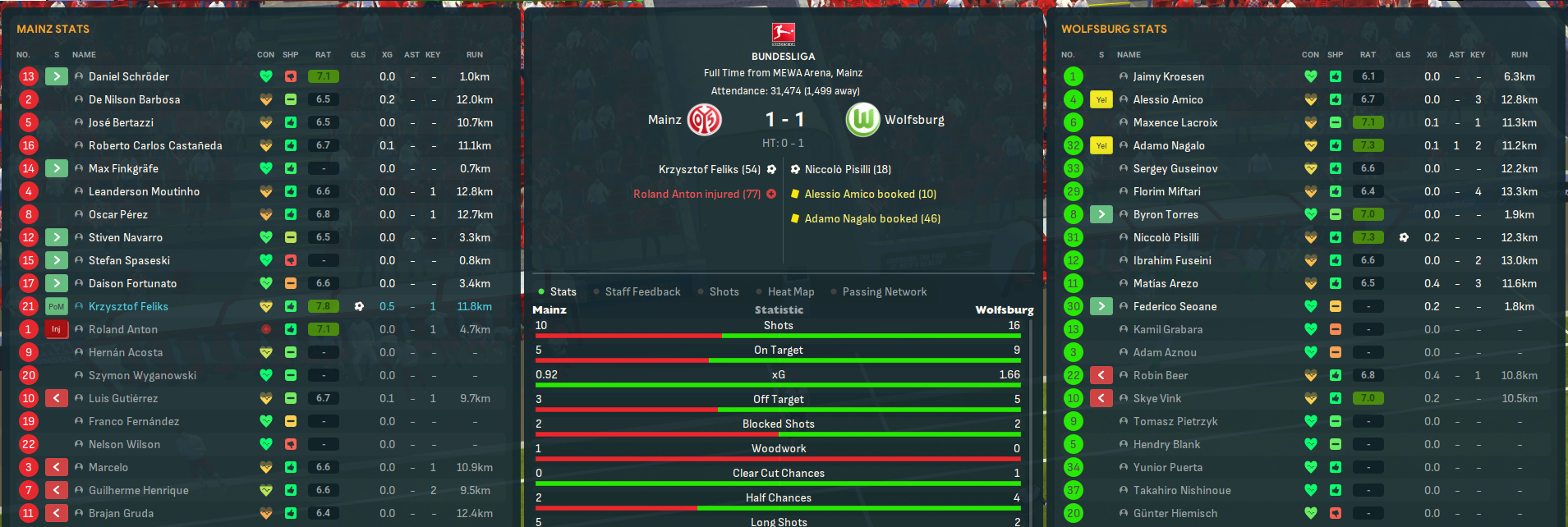 Their first home game wasn’t much easier as they welcomed Wolfsburg and they again conceded the first shot (which really isn’t helpful). They improved after the break and a shocking backpass gifted an equaliser to striker Kryzsztof Feliks. Both sides had chances but, despite losing goalkeeper Roland Anton to a broken arm (how often does this have to happen!), which forced Schroder on to quickly replace Tursi as the youngest player aged just 16 years 117 days, Mainz held on for their 1st point.