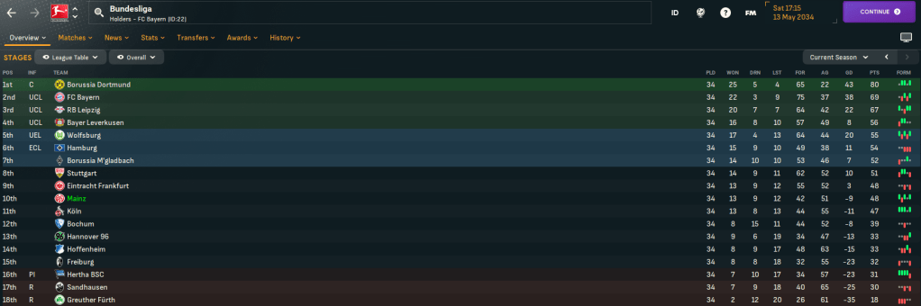 They finished the campaign safely in mid-table, taking 48 points after 13 wins, 9 draws and 12 defeats, scoring 42 and conceding 51. They finished 17 points clear of the dropzone and only 4 points off the European places. At the top of the table, Dortmund stopped Bayern’s run of 7 successive titles and 21 out of 22 by winning their first Bundesliga for 22 years by 11 points.