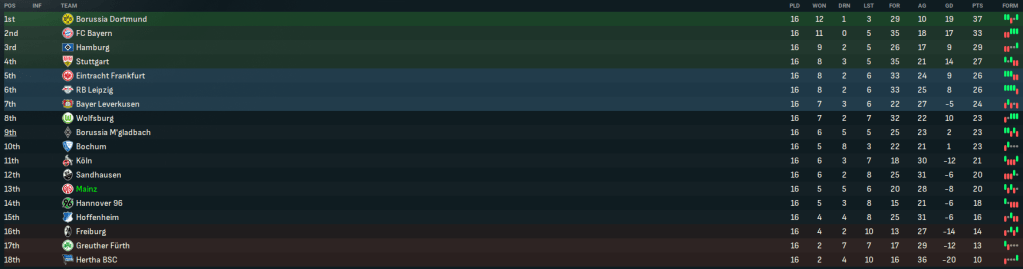 Injuries were a huge feature of the first few months, including star homegrown defender Volker Breidenbach missing 3 months with a damaged spine. But his return and a switch to a more defensive 4-4-1-1 saw Mainz earn a 0-0 at home to Koln and nick their first away 2-1 at bottom-side Hertha. A big test of the new approach was the visit of Bayern, who dominated and won 3-0. But Mainz picked themselves up to win 2-1 at Sandhausen, who were flying in 7th place, courtesy of Gruda’s brace. That was bettered by midfielder Luis Gutiérrez’s strike edging a 1-0 at home to 3rd-place Hamburg before an own goal and centre-back José Bertazzi’s header earned a smash-and-grab 2-0 win over leaders Dortmund. And those results saw Mainz head into the winter break in 13th place, 6 points above the relegation positions.