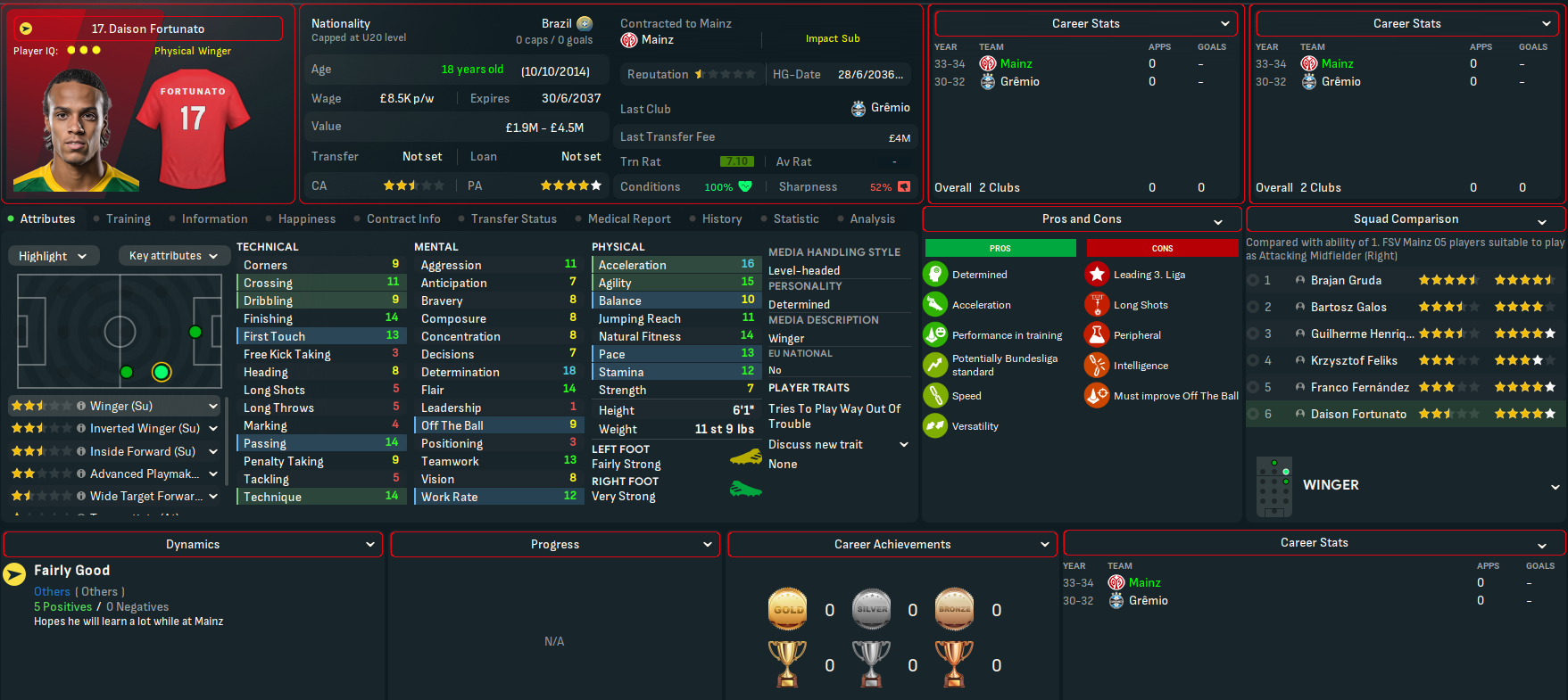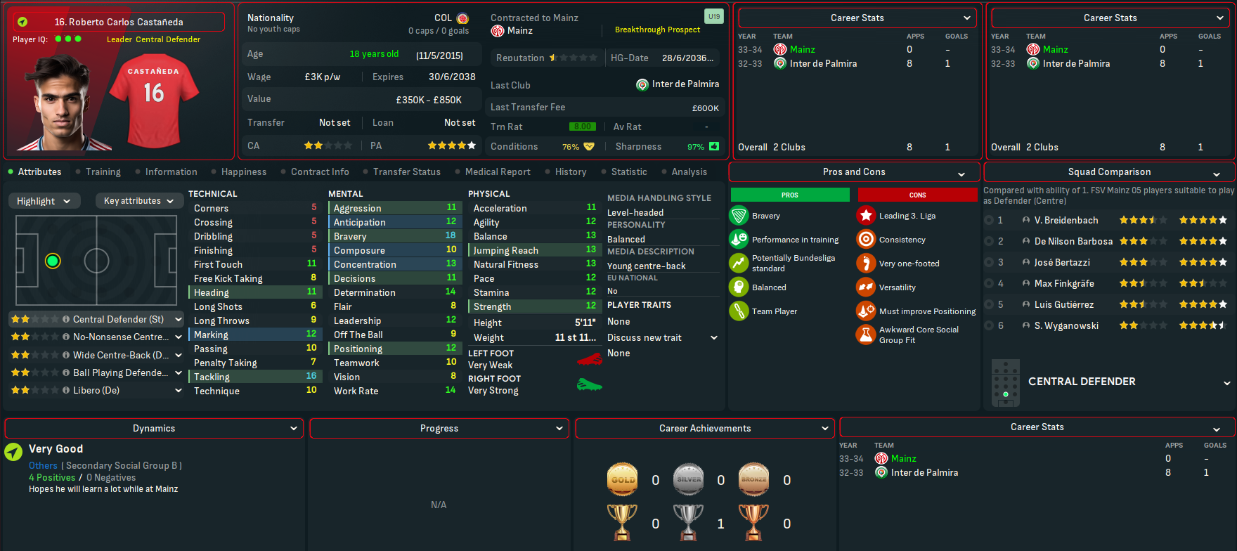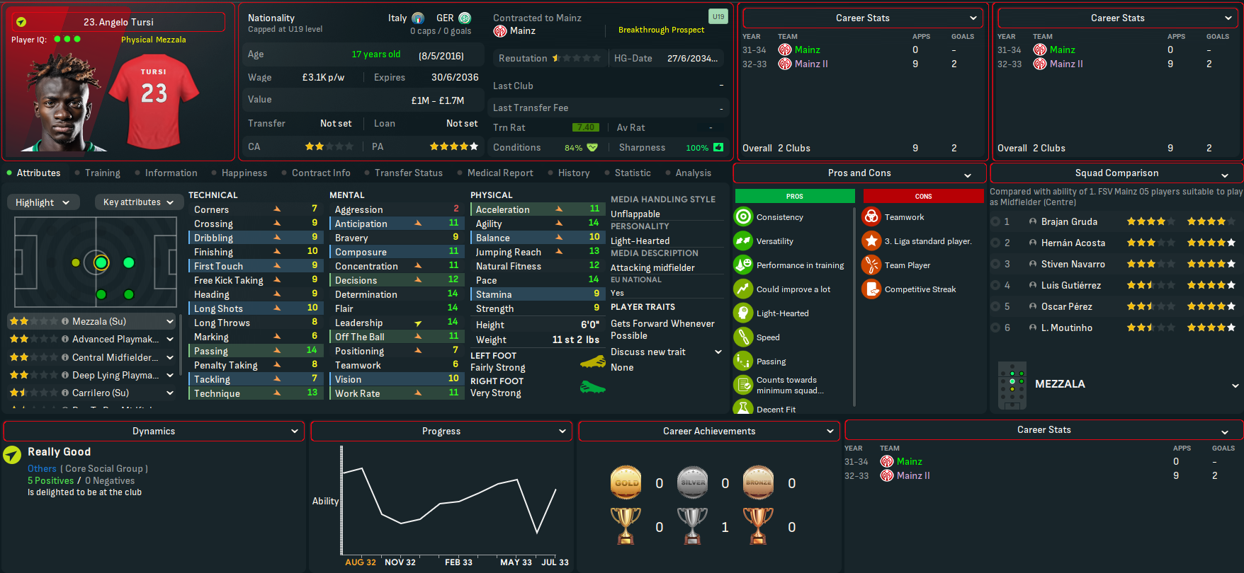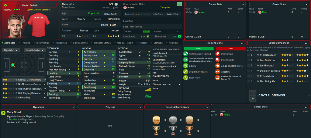 Breidenbach made it to 13 on the NxGn list with his centre back partner Bertazzi at 41. Breidnebach also won the Vereinigung der Vertragsfussballer Fussball-Bundesliga Newcomer der Saison award with Schroder in 2nd. And the potential at Mainz was boosted by another good youth intake led by Marlon Endress, who comes in as the 8th-best centre back at the club. He was joined by four more elite talents in winger Rachid Salhi and holding midfielders Dirbaz Doster, Jesse Berndroth and Thomas Klassen. They also had a promising winger in Nicola Zanellati, a few more decent midfield options and a solid goalkeeper.