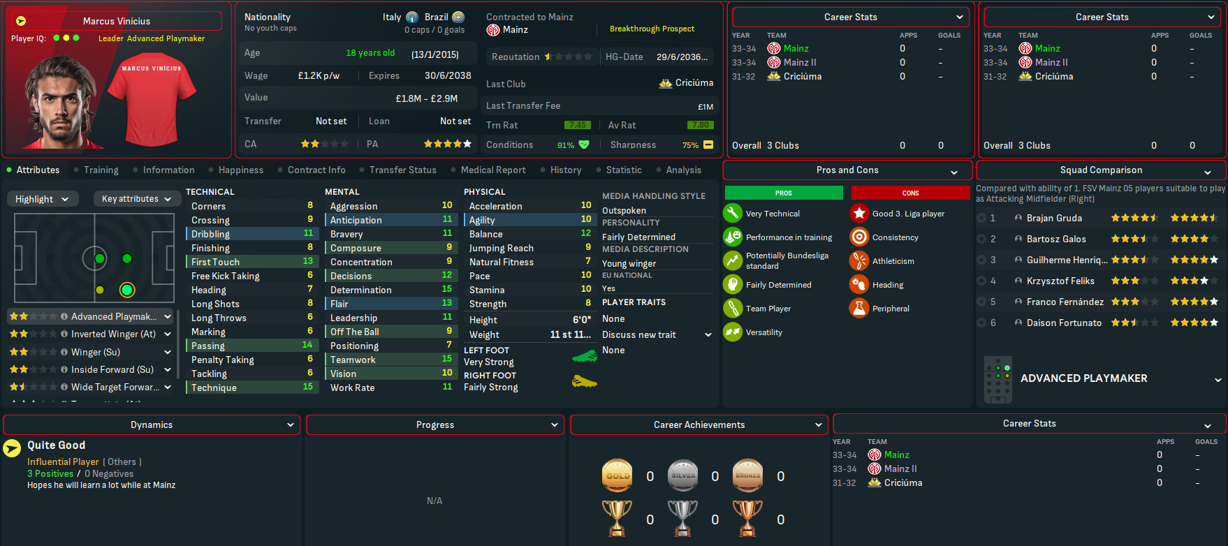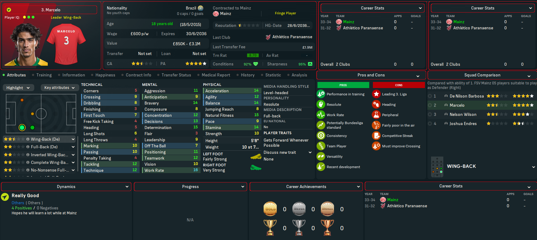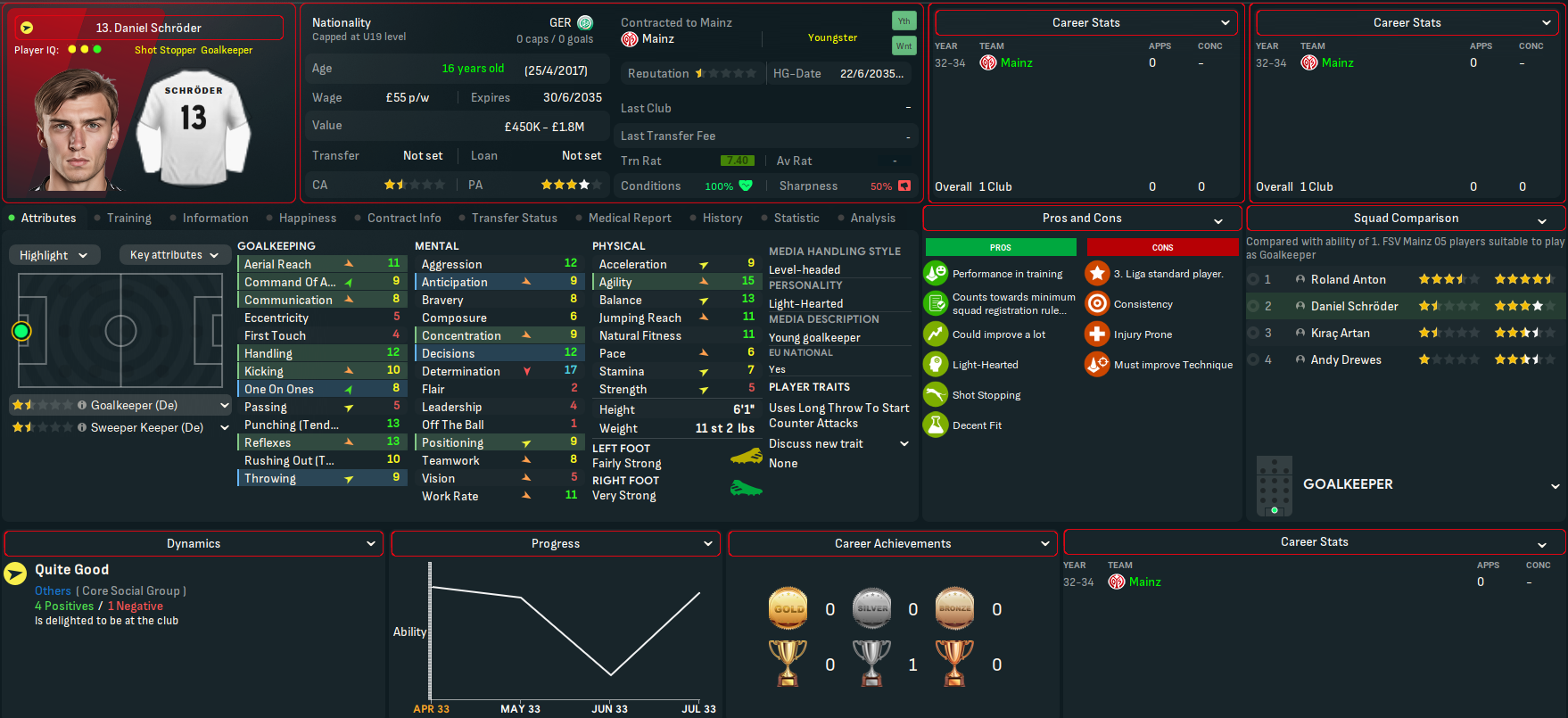 Breidenbach made it to 13 on the NxGn list with his centre back partner Bertazzi at 41. Breidnebach also won the Vereinigung der Vertragsfussballer Fussball-Bundesliga Newcomer der Saison award with Schroder in 2nd. And the potential at Mainz was boosted by another good youth intake led by Marlon Endress, who comes in as the 8th-best centre back at the club. He was joined by four more elite talents in winger Rachid Salhi and holding midfielders Dirbaz Doster, Jesse Berndroth and Thomas Klassen. They also had a promising winger in Nicola Zanellati, a few more decent midfield options and a solid goalkeeper.