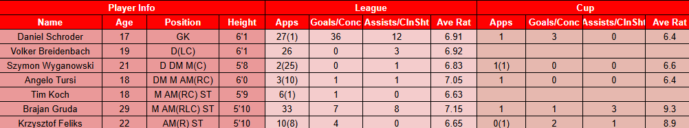 While the pick of the youth sides was striker Maciej Wasilewski, who scored 20 in 30 games. And the other key performers were the following, click the table to see their stats.
