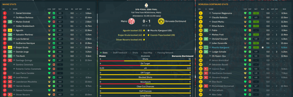Mainz’s good form carried over into DFB-Pokal, with Lazaró leading the club beyond the third round for the first time in this save. They nicked a quarter-final win over Hamburg on penalties but drew Dortmund in the semis. Henrique almost scored a total fluke after 30 seconds and they held Dortmund off until 66 minutes, when they scored a lucky goal from a freekick that proved to be the only moment of note.