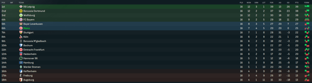That saw Mainz finish in an impressive 7th place on 51 points – just 4 points behind Bayern – after 14 wins, 9 draws and 11 defeats, scoring 45 and conceding 41. Mainz had the 5th-best home record, taking 38 points and losing just once in 17 games, but the 5th-worst away record, taking 13 points and winning just 3 times in 17 games.