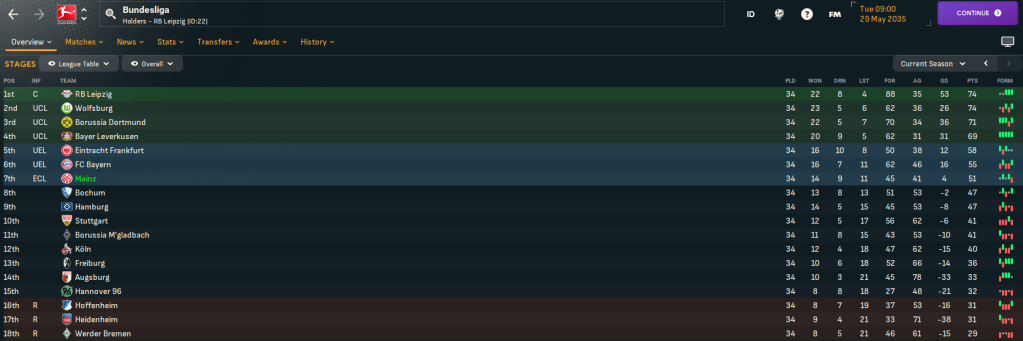 Gutiérrez earned a 1-1 in a poor game at home to Bremen the day after Hamburg lost at Leverkusen, which took Mainz 2 points clear of them with 2 games remaining. The penultimate game took Mainz to 12th-place Koln and they pulled off a 2-0 victory 2ith late goals by Gruda and centre back José Bertazzi. The next day, Hamburg drew 0-0 with Heidenheim, which ensured Mainz secured 7th place, and they moved just 1 point behind Bayern, who were lingering down in 6th! However, the final day saw Mainz host Wolfsburg, who needed to win for a chance to win the title in a thrilling final-day title battle. They did just that, with a 93rd-minute winner, but that wasn’t enough to win the league as Leipzig crushed Hamburg 6-0 to win their second title.