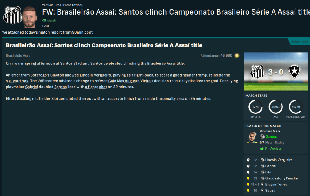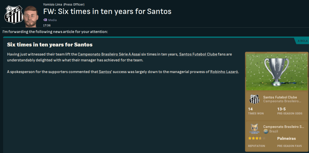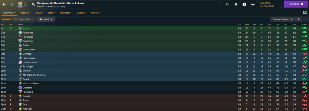 Santos won Série A by 14 points, finishing with 96, which is the highest points tally of this save, after a new club record 30 wins, 6 draws and 2 defeats, scoring 71 and conceding just 21.