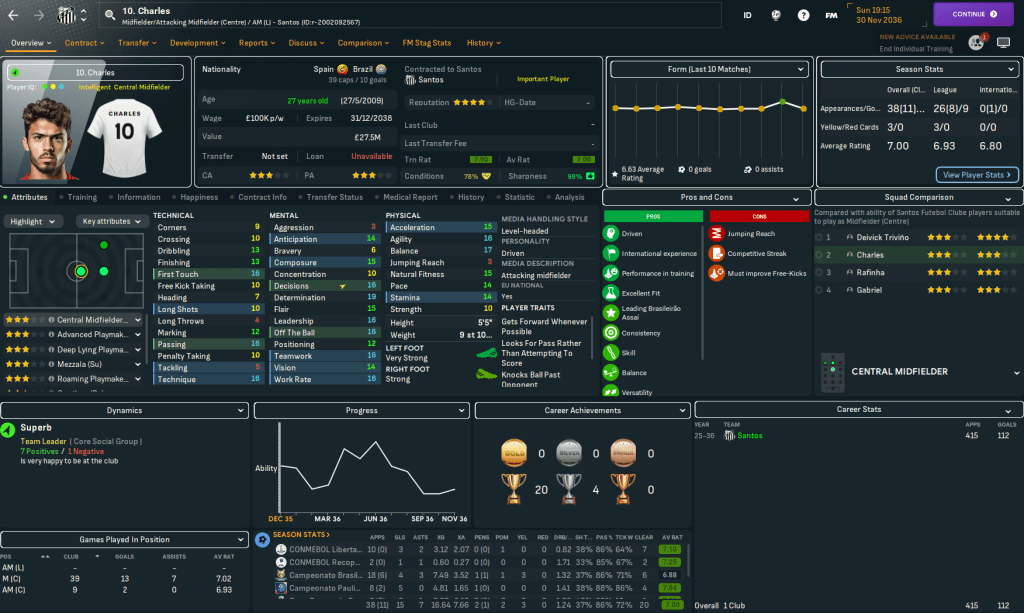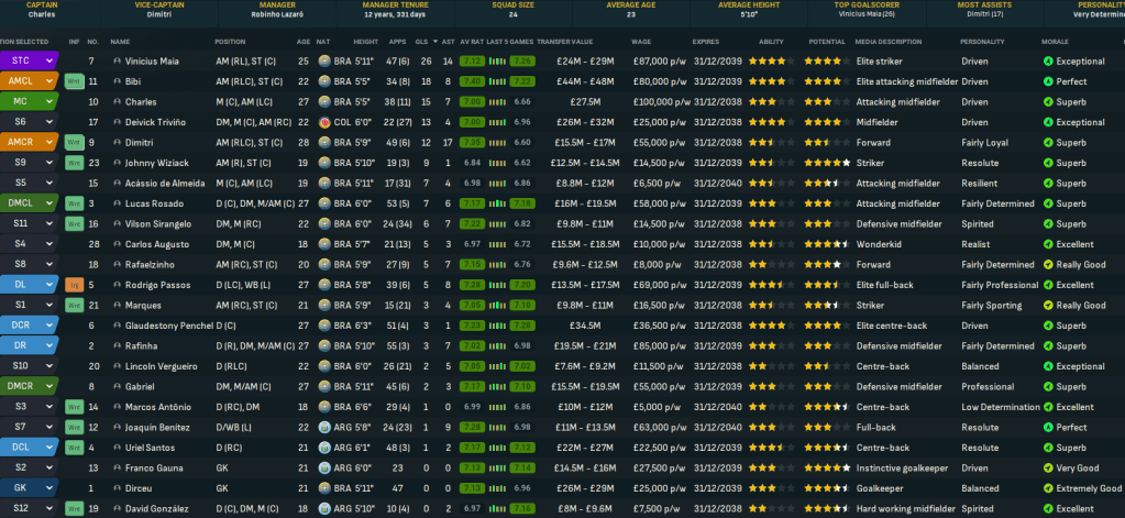 Dimitri finishes this save with Santos’ leading Ginga rating of 81, pushed close by Maia’s 80. Rosado leads the way with 580 games in all competitions, which is 53 per season!, since coming through the academy in 2025, ahead of Dimitri (560), Charles (535), Penchel (488) and Rafinha (482). Rosado also extended his club record league appearances to 446, ahead of Dimitri (432) and Charles (415). Whgile Charles is the top scorer at the club with 112 in the league and 153 in total. Check out all the players’ career stats and attributes by clicking the chart below.