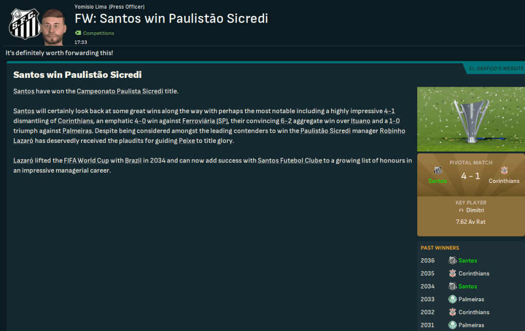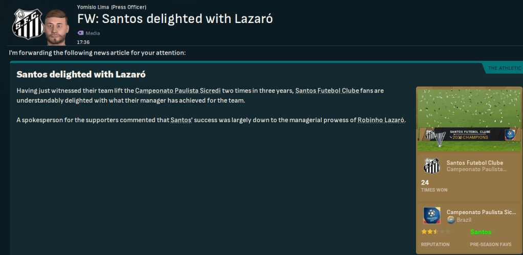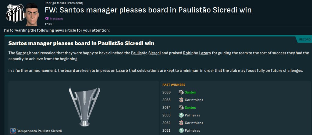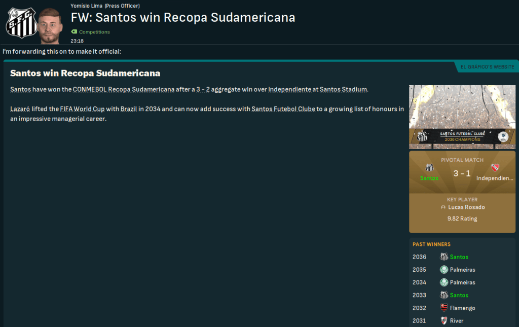 An epic bottle job saw Santos Futebol Clube hand the Série A title to Flamengo, only to impressively recover their nerve and win their second Copa Libertadores of the Robinho Lazaró reign. Heading into 2036, Lazaró was fully focused on regaining the Brazilian league crown in what he planned to be his final season at Santos.
