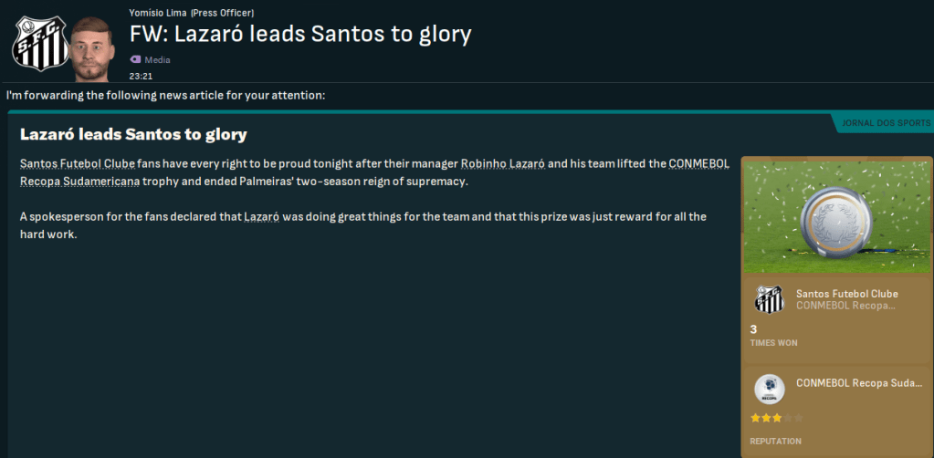 Lazaró departs Santos after 12 successful seasons, in which he led the club to an immediate promotion from Série B in his first season. He then led Santos to six Série A titles, two Paulista state championship titles, two Copa Libertadores, two Recopa Sudamericana, one Copa do Brasil and four Supercopa do Brasil, and saw the club establish the best youth system in the world. He also led his nation Brazil to win the World Cup in 2034.