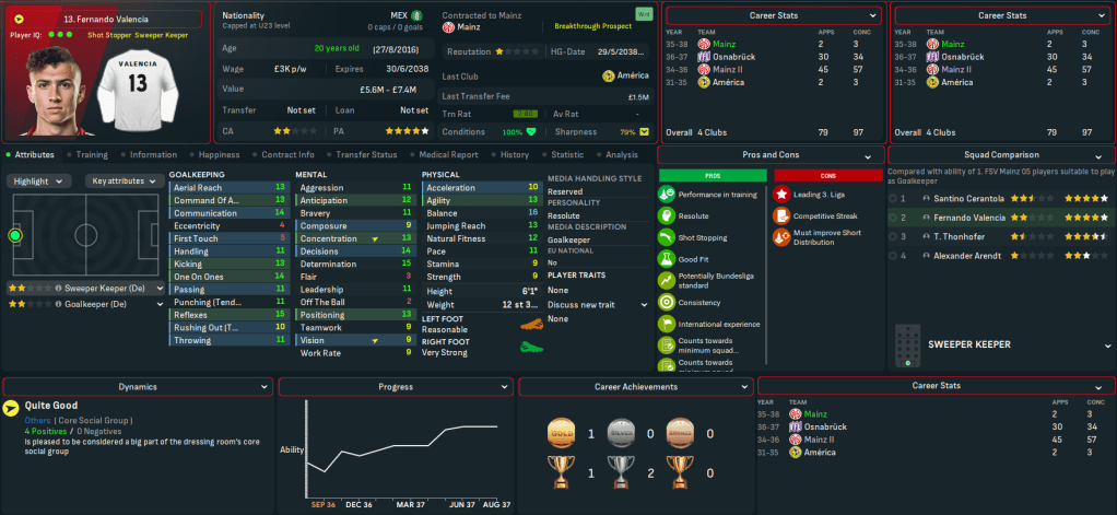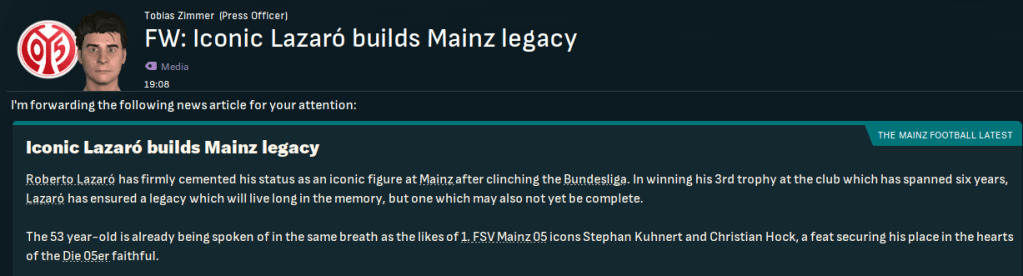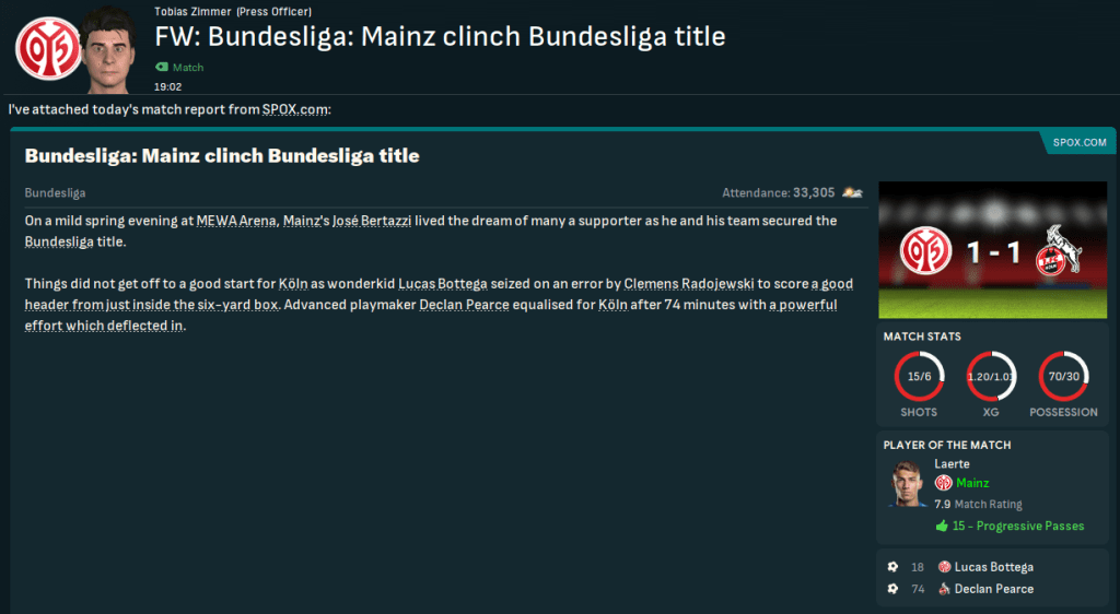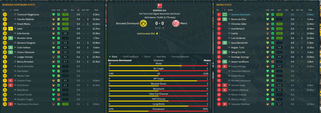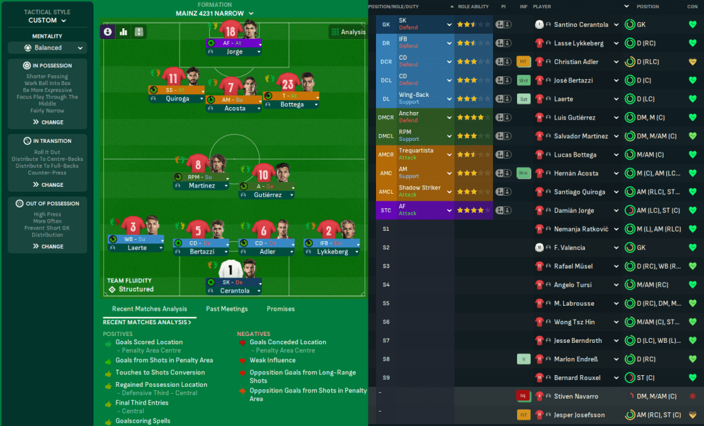 The decision to move Jorge up top started well as he scored both in a 2-0 win at home to Stuttgart and scored again either side of a brace by attacking midfielder Nemanja Ratkovic. Then he obviously got injured! But the team continued the strong start without him, with the tweaked tactic working an absolute treat as Mainz went unbeaten through the first 11 league games, including attacking midfielder Santiago Quiroga edging a 1-0 win at home to Leipzig. That teed up a big game at home to 2nd-place Dortmund in mid-November, in which Martínez drilled home a penalty after Quiroga was fouled but the visitors grew into it and nicked a point. The unbeaten start ended with their customary defeat at Bayern, where Mainz have still never won in this entire save, but went into the winter break with a 6-point lead over Dortmund