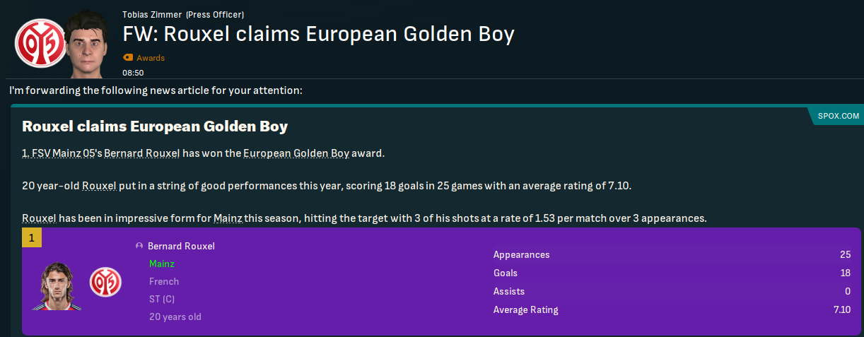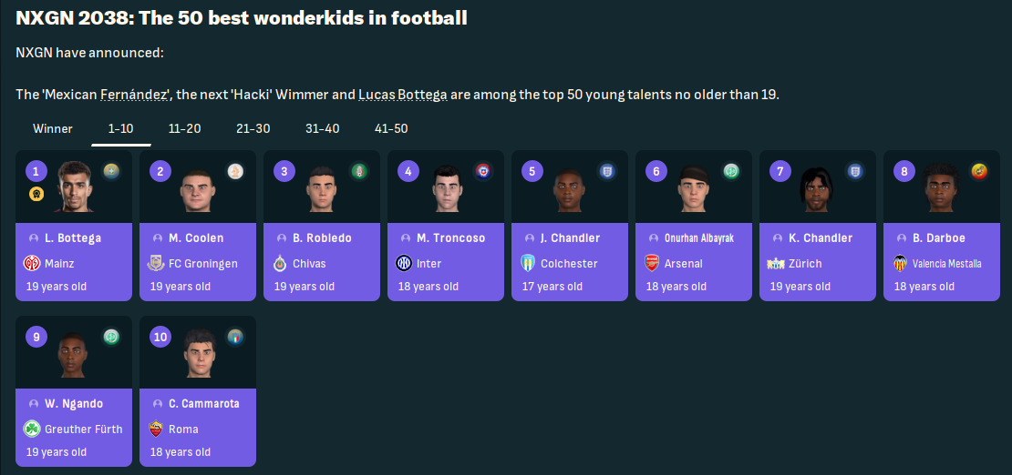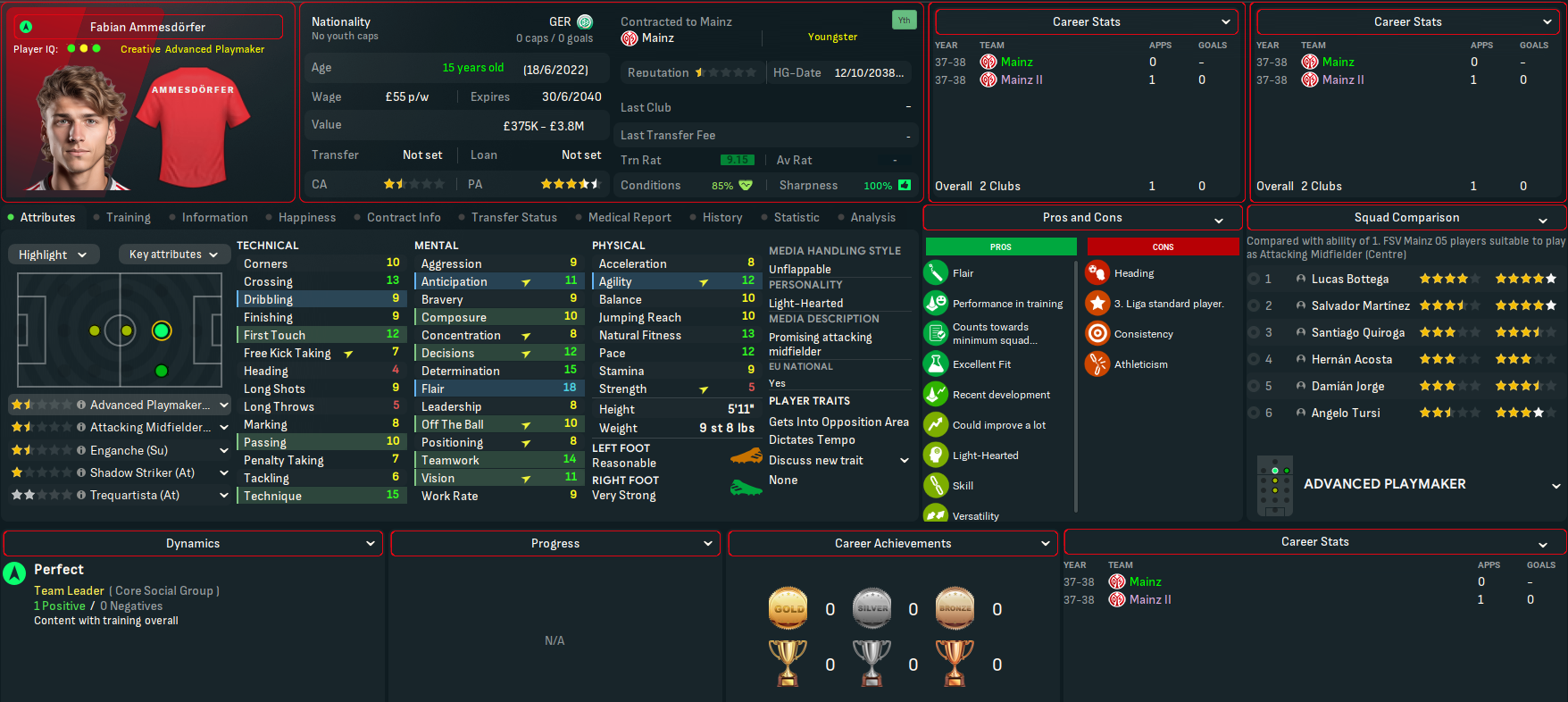 Rapidly improving striker Bernard Rouxel became the first Mainz player to win European Golden Boy, but Bottega is clearly the player to watch as he became the club’s first NxGn winner. They got another youth intake that was decent but didn’t deliver on the promised 2 As preview, but provided decent prospect attacking midfielder Fabian Ammesdorfer.