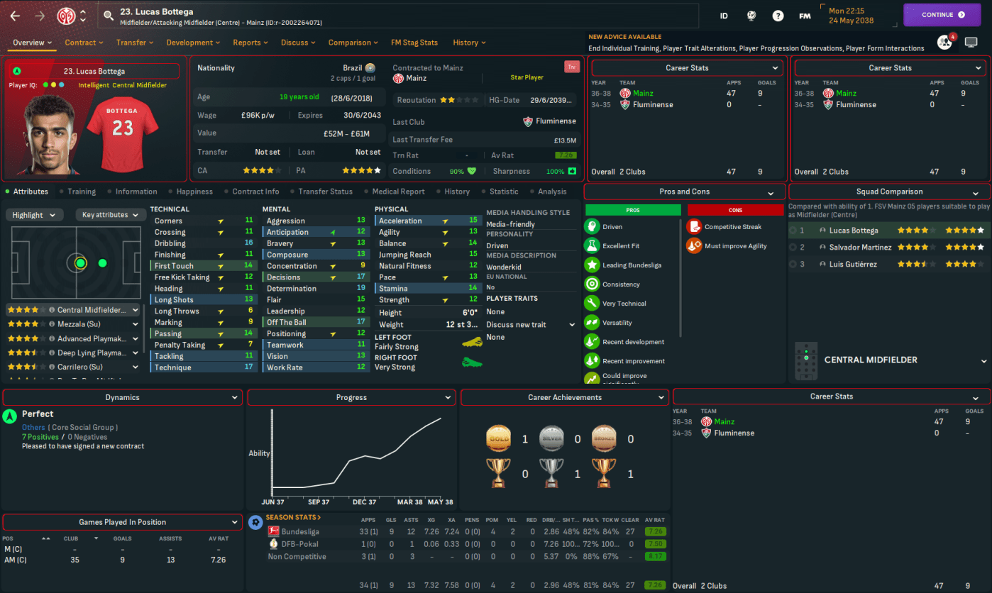 Mainz’s improvement was inspired by several of their youngsters showing dramatic development this season. Top of that list was Bottega, whose first-team experience saw him suddenly jump from 2.5-star to 4-star ability in early February, and then earn his Brazil debut against Croatia in March and score on his 2nd cap against Nigeria. Pushing him close was the fantastic Laerte, who’s become a superb attacking full back with 11 assists and a 7.52 average rating.