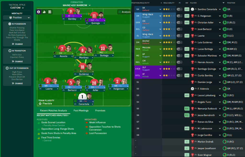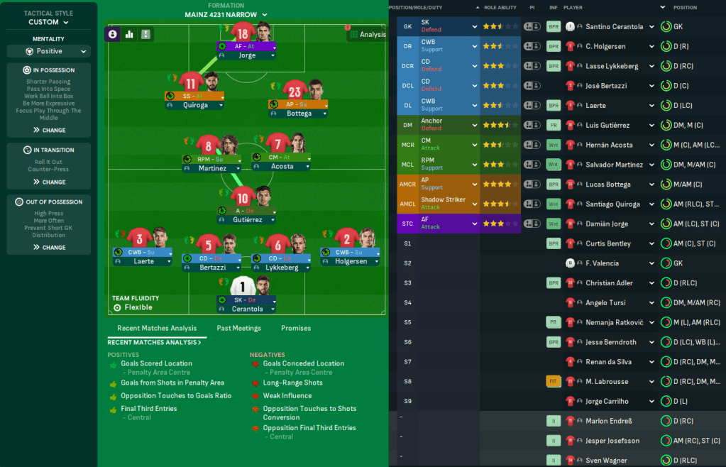Lazaró began the season with the 4-1-3-2 approach, and it started well as Salvador Martínez, operating in the advanced playmaker role, laid on goals for Acosta and debutant Bentley to down Hamburg 2-0. The manager marked 800 games in football with an early trip to Bayern and the new approach looked even better as Martínez and Santiago Quiroga earned a narrow 2-1 win – which was Lazaró’s first win at Bayern and Mainz’s first in 18 attempts in this save! The strong start continued, built on a rock-solid defence, including striker Damián Jorge nicking a 1-0 win at Dortmund that moved Mainz 7 points clear by December. They took that lead and an unbeaten record into the winter break, which prompted the Mainz board to hand Lazaró a new five-year contract on £55k a week.