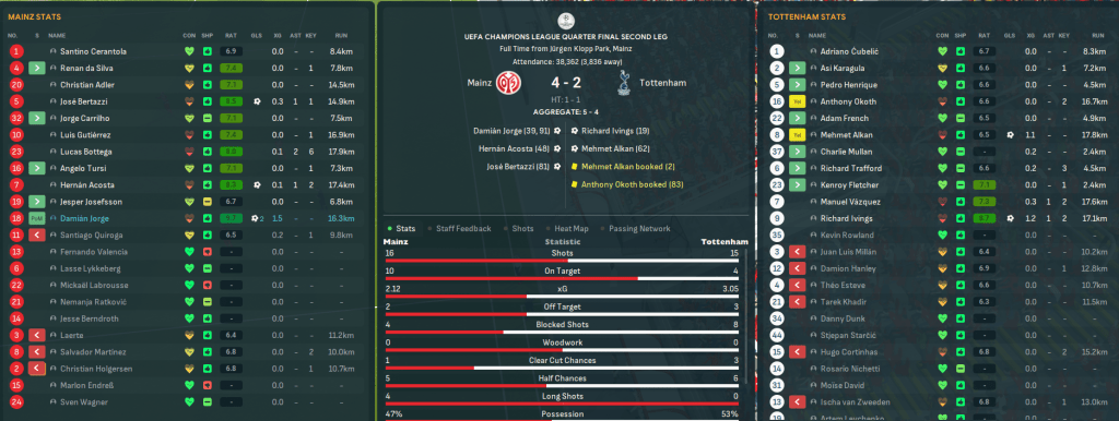 They drew an ageing, declining Man City in the last 16, and Quiroga’s late volley earned a 1-1 away before a dominant home win as a rare double by left back Laerte led a 5-2 thrashing. Another English side followed in 2033 winners Spurs, and Mainz got a little lucky to only lose 2-1 away. Spurs obviously scored their first shot in the return leg but were Mainz were much the better side and drew level through Jorge’s powerful strike. Lazaró laid into them at the break and got his reward with a wonderful 25-yard Acosta volley. Spurs undeservedly levelled from a corner goal but Mainz again drew themselves level as captain José Bertazzi headed home a corner. That took it to extra time, Lazaró stayed on the attack, and was immediately rewarded as Bottega’s superb through-ball sent Jorge through for his second. And that proved enough to edge a 5-4 aggregate win.