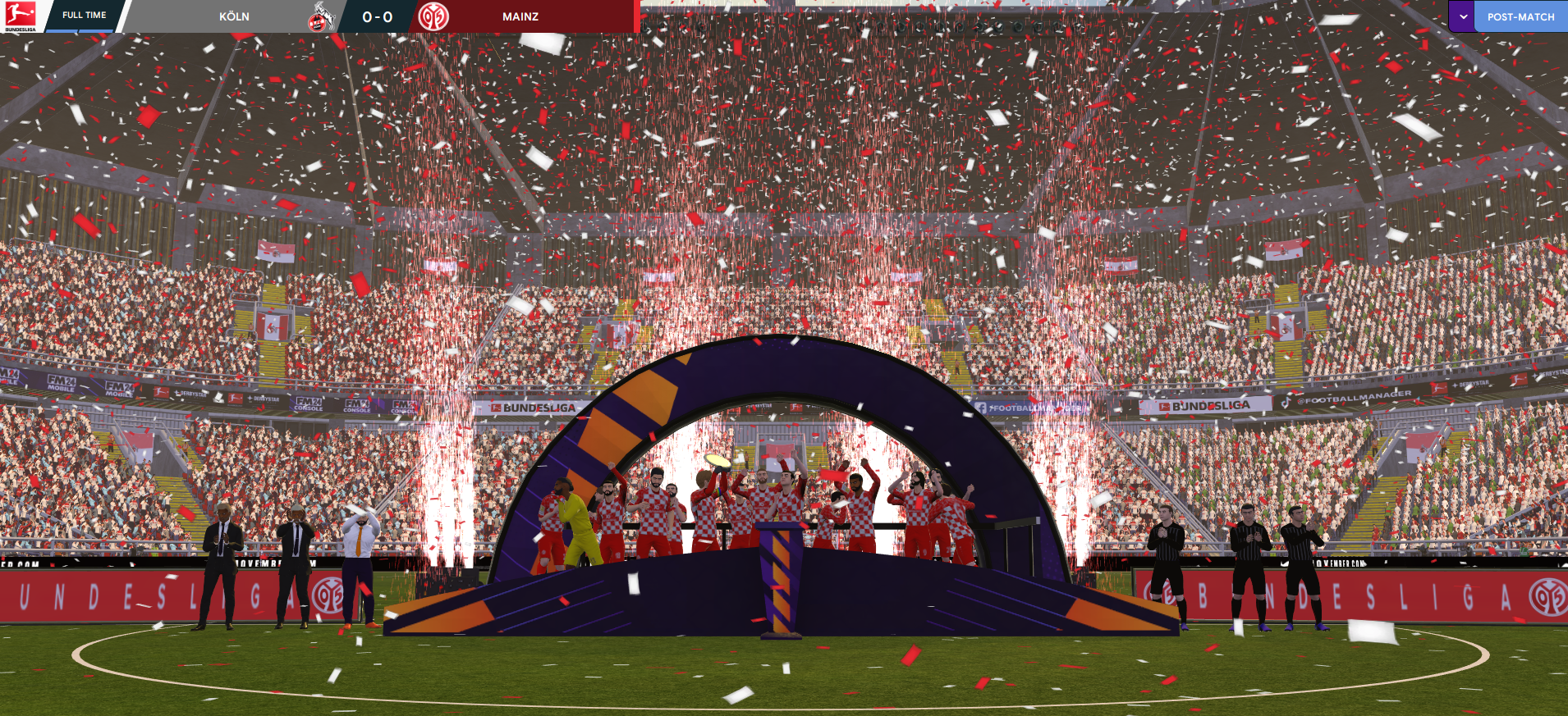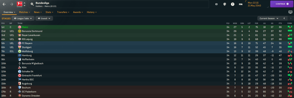 Mainz celebrated their third consecutive title and waved farewell to their now legendary manager Roberto Lazaró on the final day. And a week off allowed the players to recover and relax and thrash Wolfsburg 5-0 led by a Quiroga brace. That saw Mainz win the title by 4 points, finishing on 86 after 27 wins, 5 draws and 2 defeats, scoring 75 and conceding just 18. Bottega led the way with 16 assists and had the 3rd-best average rating of 7.39.