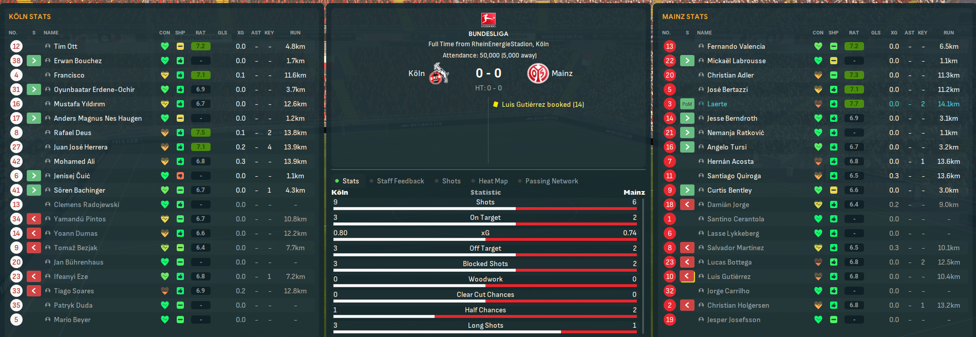 A point at home to Dortmund would seal three titles in a row for Mainz, but they came into it with Bottega and both centre backs injured from the Chelsea first leg a few days earlier. The effect of that game was clear early on as Dortmund dominated and eventually took advantage from a late corner to cut Mainz’s lead to 6 points with two games remaining. Dortmund won before Mainz went to Koln and goalshy Quiroga smashed a shot against the bar after 5 minutes. A tired team tailed off after halftime but held on for a 0-0 that sealed another title.
