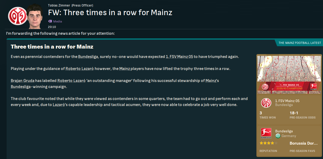 The homegrown stars of 1. FSV Mainz racked up consecutive Bundesliga titles and showed their ability to compete with Europe’s best in an exciting 2038/39 campaign. Now, Roberto Lazaró was looking to make it three in a row as he mulled over this being his final season in football management.