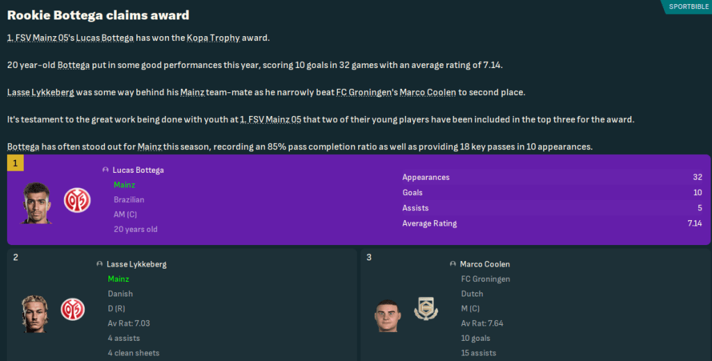 And just as proof of how good these Mainz youngsters were, Bottega became the first Mainz player to win Kopa Trophy with centre back Lasse Lykkeberg claiming an impressive 2nd place. Then Holgersen won NxGn with Bentley in 2nd However, they had easily the worst youth intake of this entire save.