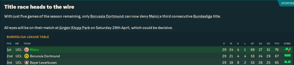 That gave Mainz even more confidence as they opened up a 14-point lead by the end of February, and even a rotated side got a 1-1 at home to 4th-place Leipzig. But they finally lost 3-2 at Leverkusen, which set up a two-way title race with Dortmund – who they could clinch the title against in late April.