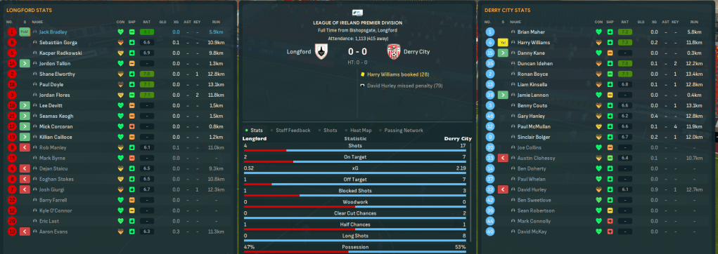 A week later, Longford got battered 4-1 at home to Sligo while Derry pulled off a 3-2 win at Shelbourne. They then had nearly a month off ahead of a huge relegation battle at Galway, where Longford landed the first punch as Radkowski headed in from a corner. Derry went behind at Sligo just before halftime but equalised on 77 minutes, while Longford defended superbly to secure a crucial 1-0 victory.