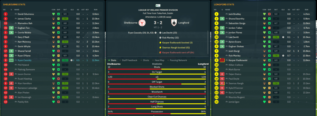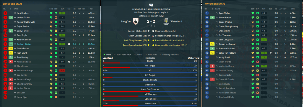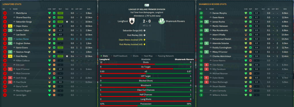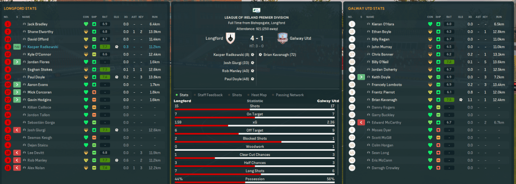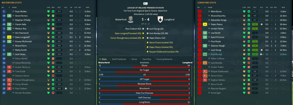 Longford’s bid for survival began with some really difficult tests. First up, they visited Waterford, who have an actual footballer Mahtal had heard of in Sean Longstaff playing. They started strongly and shocked their hosts as winger Josh Giurgi cut in from the left and converted into the bottom corner. The winger cut them open again on 20 minutes and his shot was parried to striker Rob Manley to double the lead. And they were in dreamland just before halftime as Staicu scored from a corner to take a fully deserved 3-0 lead into the break. Waterford scored from their first proper attack and grew into it but Manley’s late close-range effort killed them off.