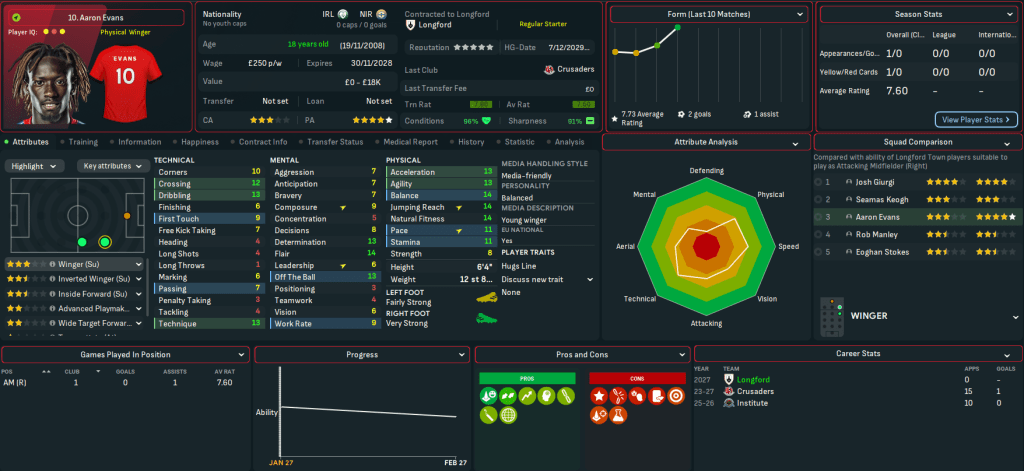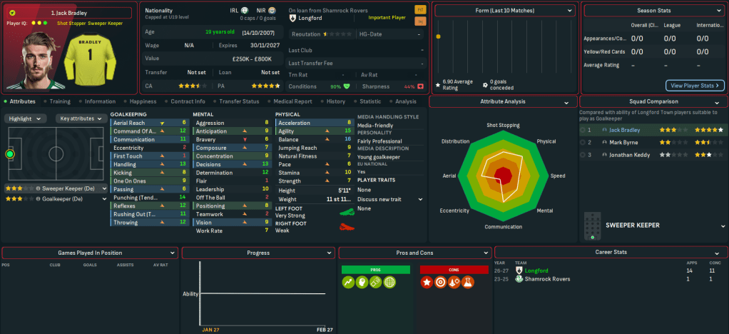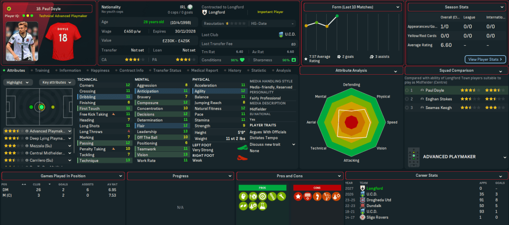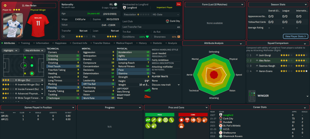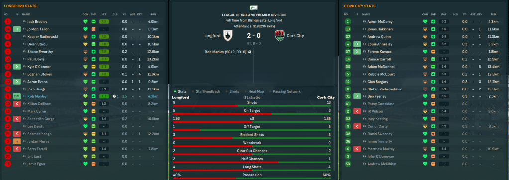 Longford continued to surprise as Manley twice put them ahead in a 2-2 at home to Bohemians, before successive home draws 1-1s with Galway and St. Pat’s. And away days were a massive struggle, including a 4-2 defeat at Derry. But Mahtal switched to his 3-4-3 for the first time at home to Cork, which worked as a solid defensive effort held them off before Manley hit a late double. He stuck with it at Shamrock and Evans and Gorga nicked an impressive 2-2.