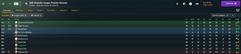 That moved Longford 9 points clear with a 16 better goal difference with three games remaining. And a few days later, their top-flight status was secured with a wild 3-3 draw at St. Pat’s while Derry hammered Galway 5-0 to relegate them.