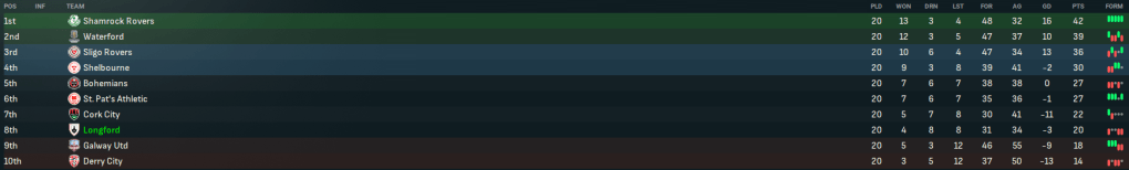 That saw Longford fall to just one position and two points above the relegation places heading into the final 16 games. But, crucially, they maintained a 6-point gap to the only automatic relegation place.