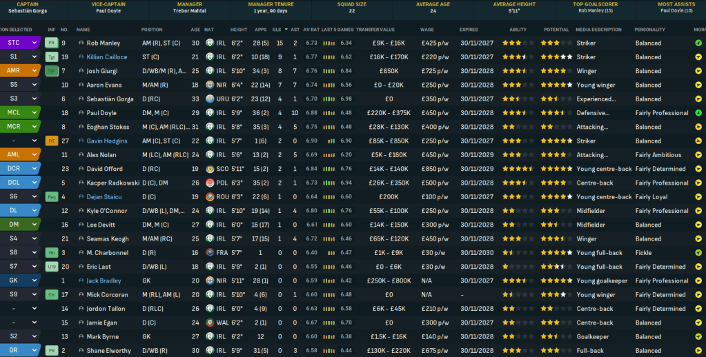 Manley again led their goalscoring chart with 15 in 30 but his form massively nosedived after announcing he’d leave the club at the end of his contract. Cailloce chipped in with 9 in 28 followed by Giurgi, who also wants out, (8), Evans (7) and Gorgá and Doyle (4). Doyle led the way with 10 assists followed by Evans and Giurgi (7) and Nolan and Stokes (5).