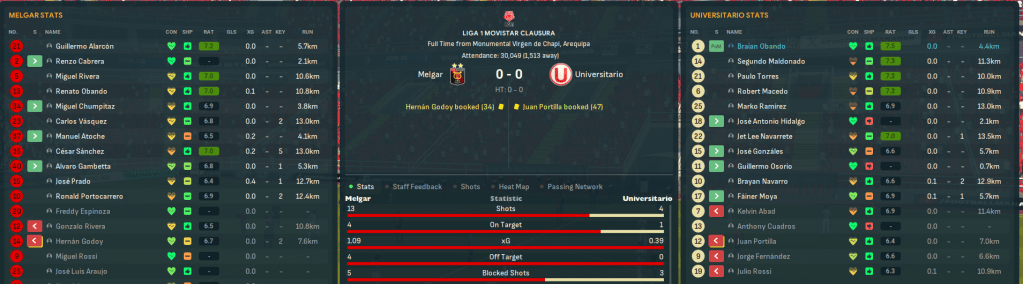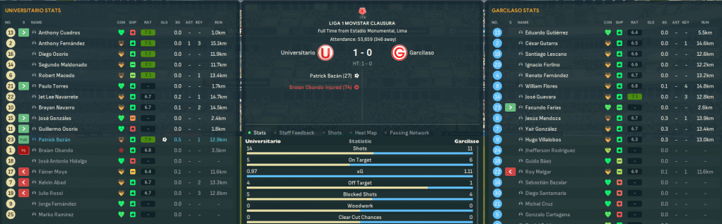 That teed up a potential title decider as an injury-hit Universitario travelled to Melgar on the penultimate day. The two sides played out a dire 0-0 in which the only real highlight was Rossi having a goal narrowly ruled out for offside 10 minutes from time. That at least guaranteed qualification for the Champions Playoff – whatever that meant – heading into the final day at home to Garcilaso. Ongoing injury issued forced Mahtal to switch things up, moving to more of a 4-3-3. They started brightly and took advantage as Bazán headed the opener on 27 minutes. Alianza also led 1-0 and Melgar raced into a 3-1 lead at Grau. Tensions increased as goalkeeper Braian Obando was forced off with a broken arm 20 minutes from time. But they held on for a 1-0 win that saw them also top Clausura.